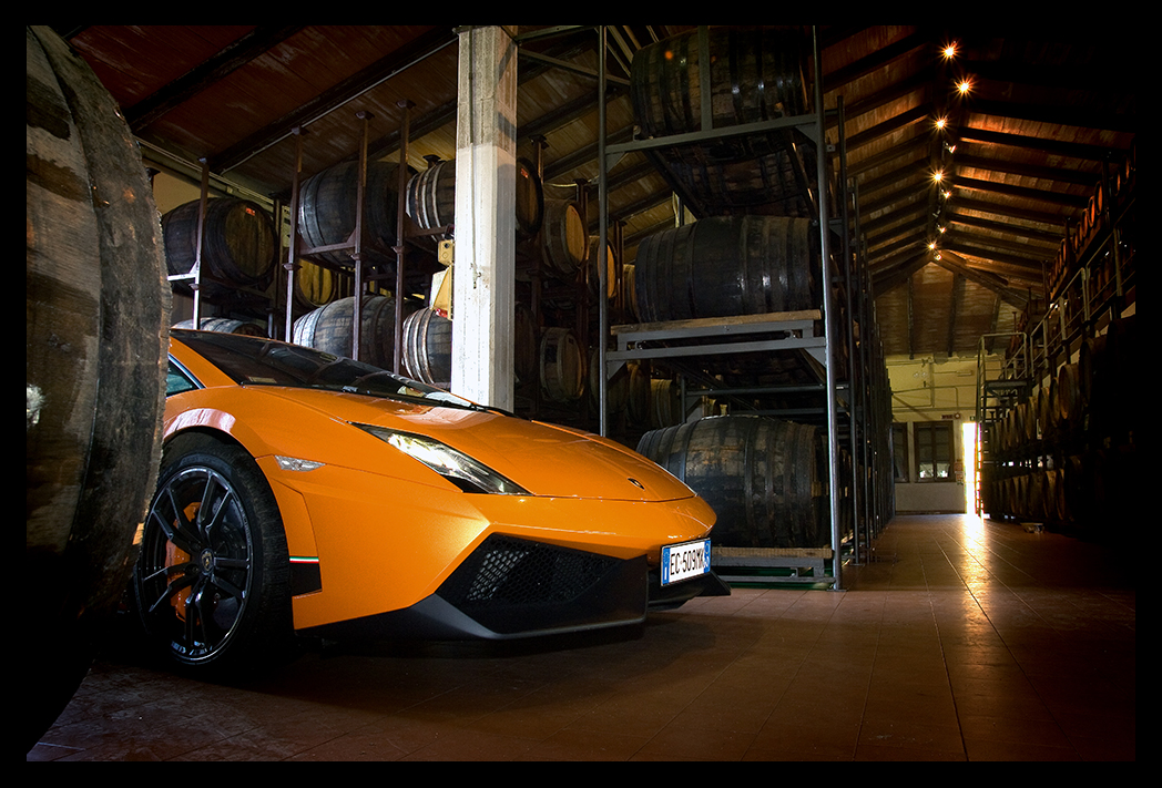 Lamborghini Gallardo Superleggera 570-4 op de zolder van Acetaia Manicardi, tussen honderd vaten met Aceto Balsamico azijn. De azijn is meer waard dan de Lambo... Castelvetro di Modena, Italië.