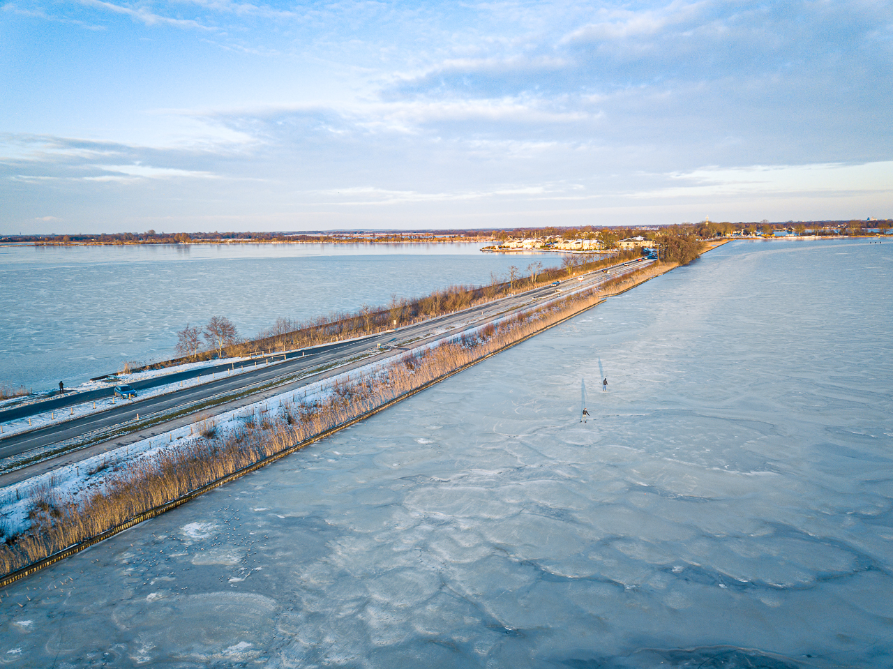 A droneshot , in frame a few iceskaters on the Belterwiede.