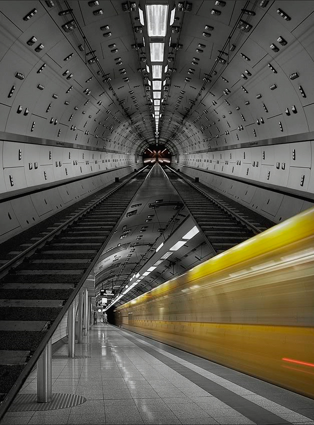 Samenvoeging van twee beelden gemaakt in het metrostation Kaiser Wilhelm Platz te Essen (D).