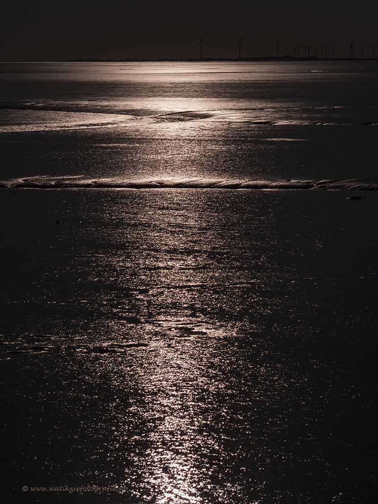 Een foto gemaakt aan het Wad, in dit geval aan de Duitse kant, de zon scheen, ik heb gebruik gemaakt van een 8 ND filter, waardoor de foto een ietsjes langere sluitertijd had, bovendien heb ik sterk onderbelicht. Hierdoor ligt de nadruk bijna volledig op de spiegeling van de zon in het slib, het was eb.