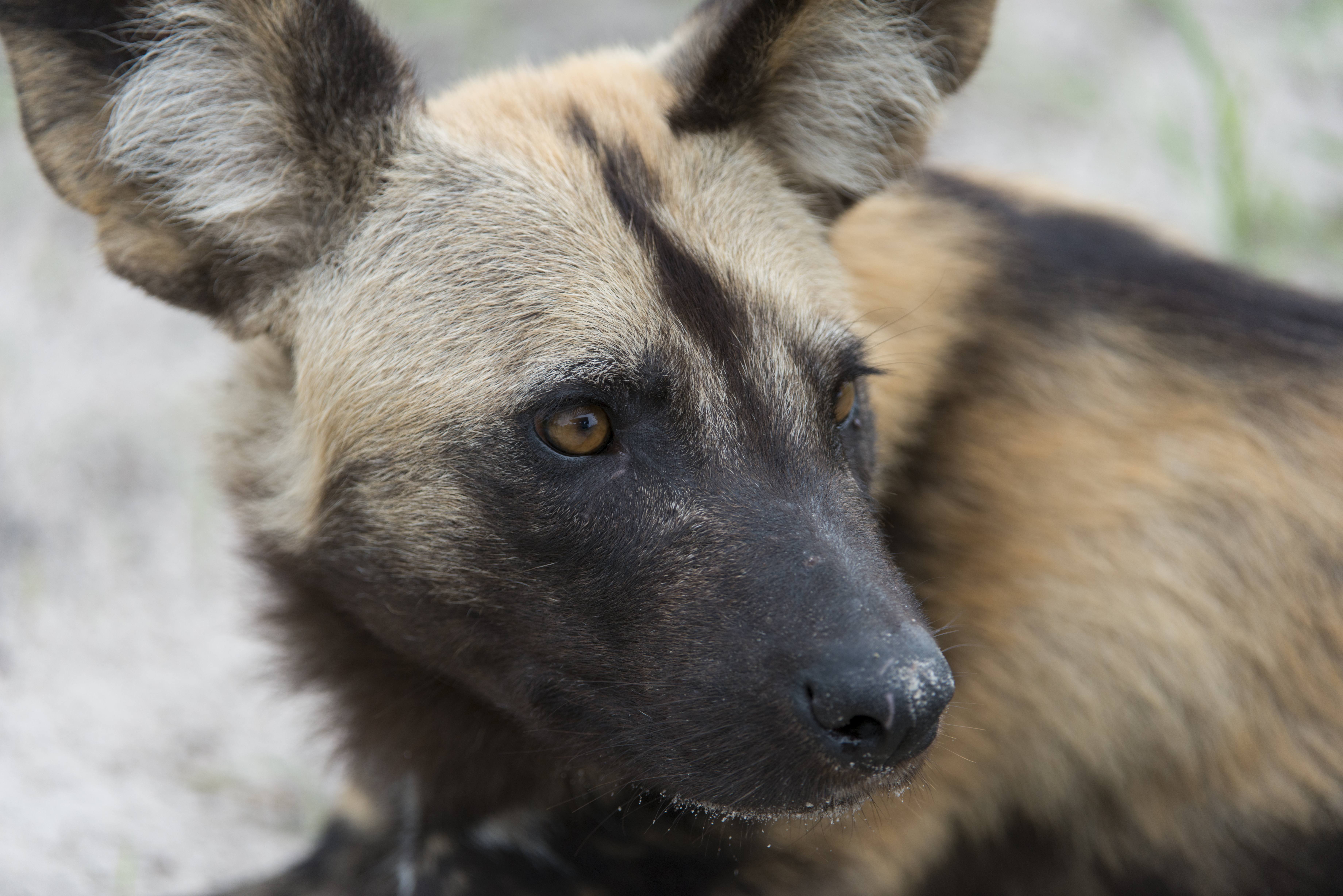 Afrikaanse wilde hond, in het oog is het voertuig te zien ( op de hoge resolutie afbeelding is dat veel duidelijker)