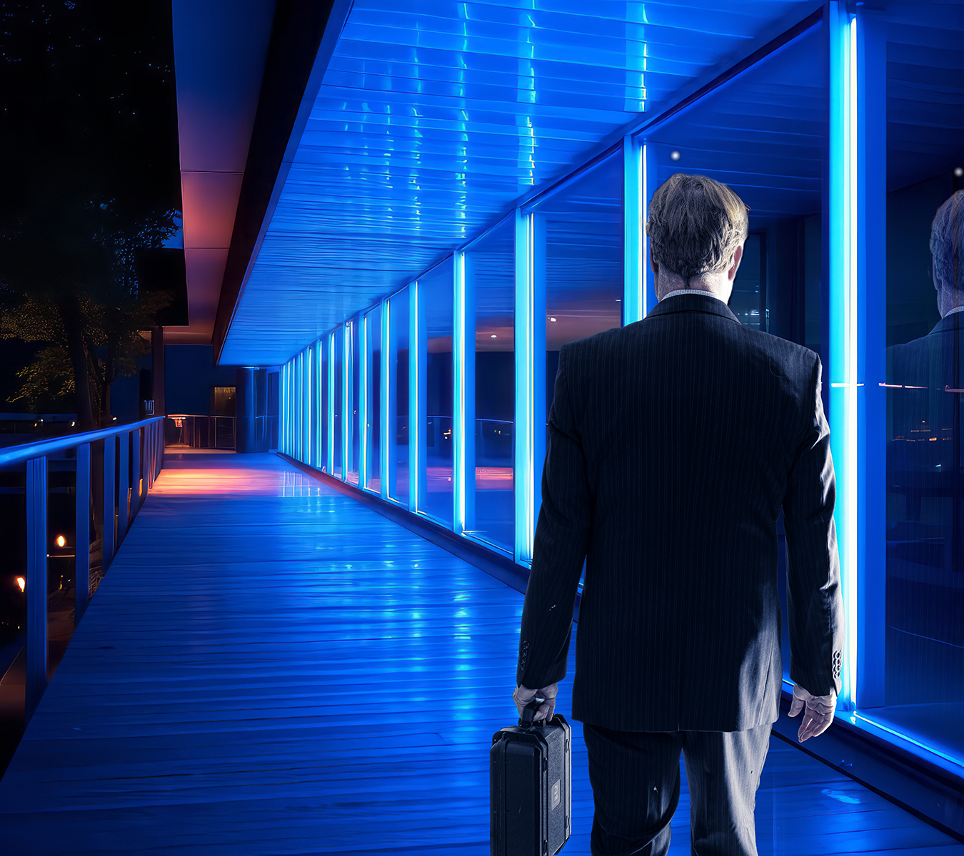 Man met koffer ruggelings gezien in een zakelijke omgeving, avondsfeer...