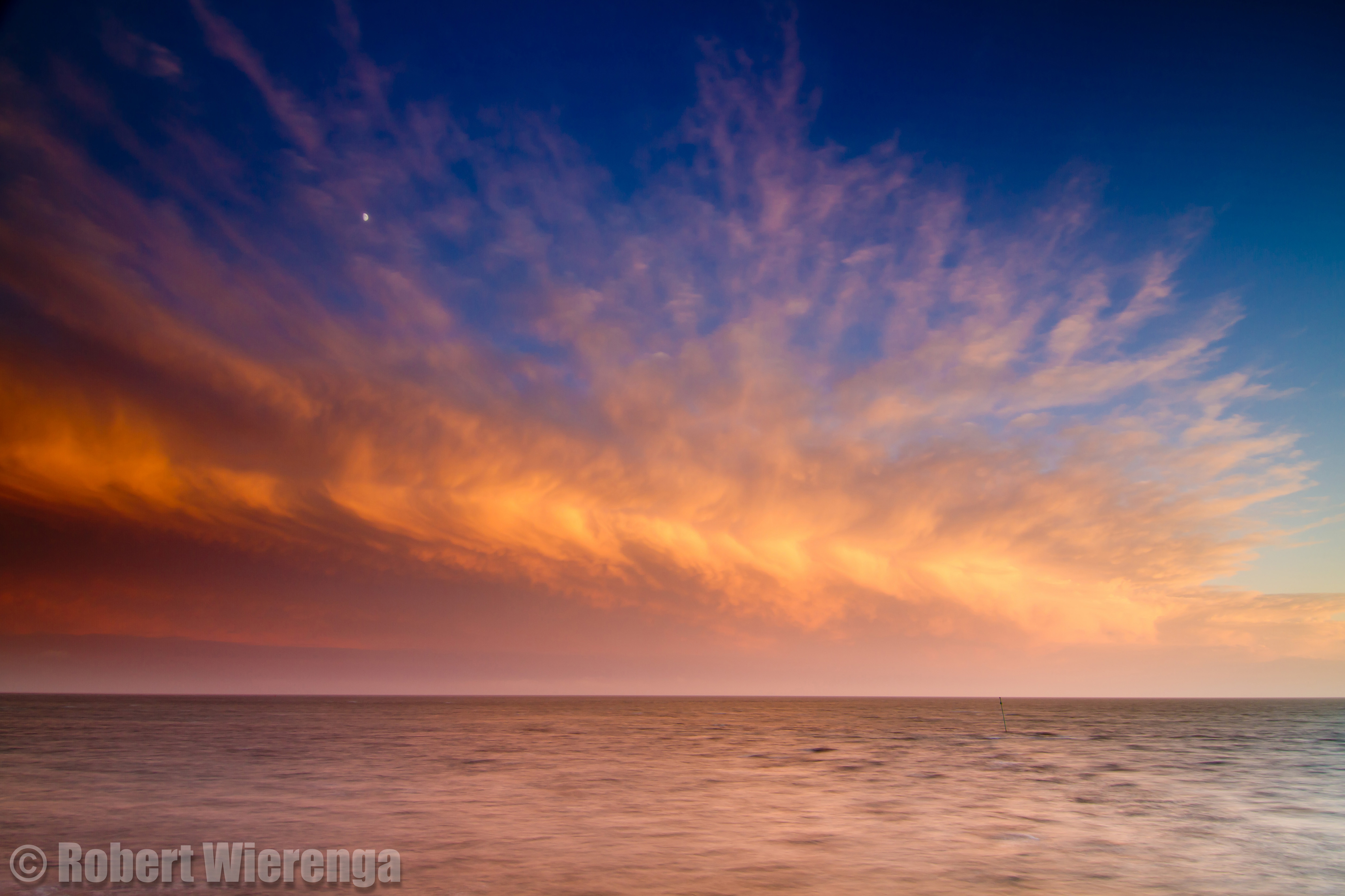 Afgelopen winter trok er een fikse storm over Nederland. Ik had het geluk toen op Vlieland te zitten. Het moment van het wegtrekken van de storm viel precies samen met de zonsondergang. Hierdoor viel er prachtig licht op de achterkant van het stormcomplex. De maan is als je goed kijkt ook in beeld te zien. Dat geeft een beetje een idee van de grootte van de wolk.