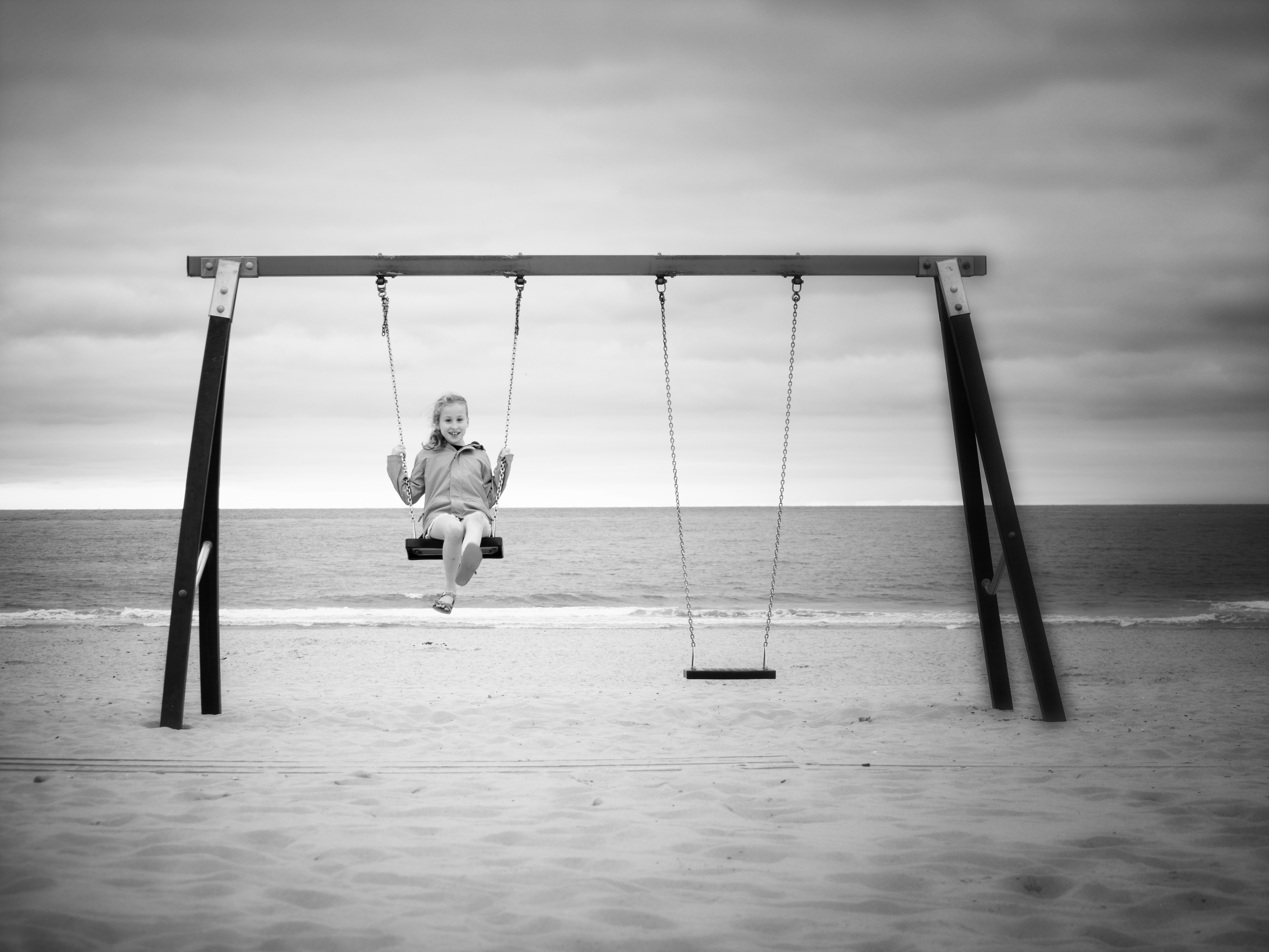 Een bewolkte avond op het strand. Helemaal alleen op de schommel.