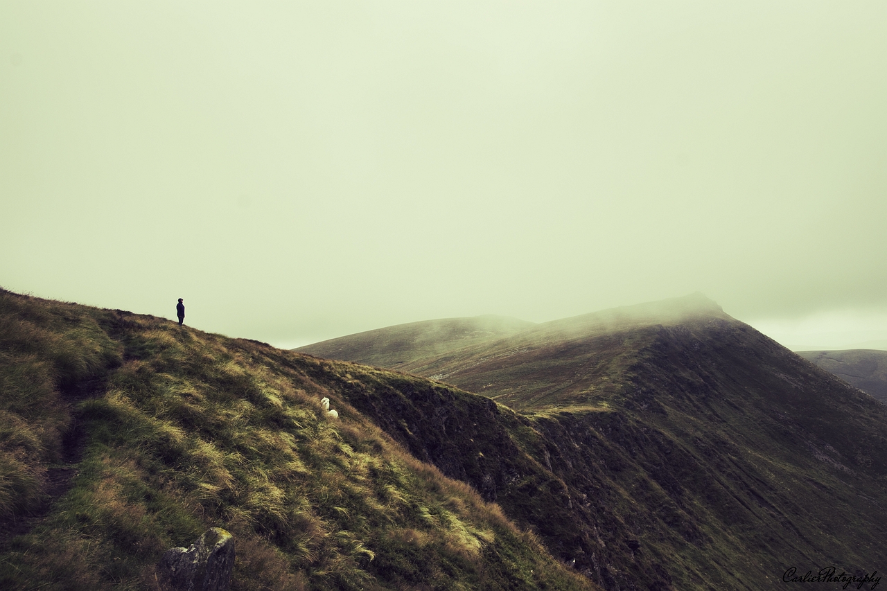 heuvels in Wales, lage bewolking, miezerig weer, maar de stilte de wind voelen heerlijk. Een avontuurlijke tocht naar top en het ultieme genieten van de natuur
