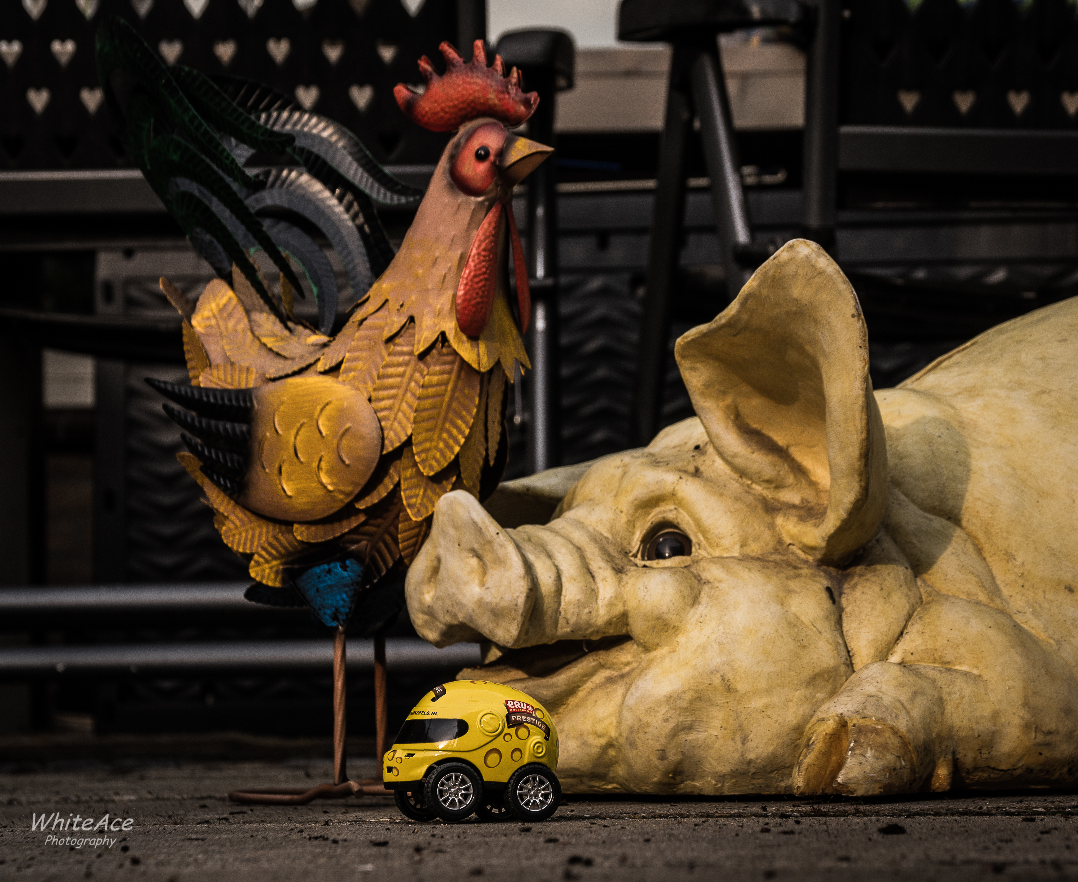 Een kip, een varken en een helmpje.