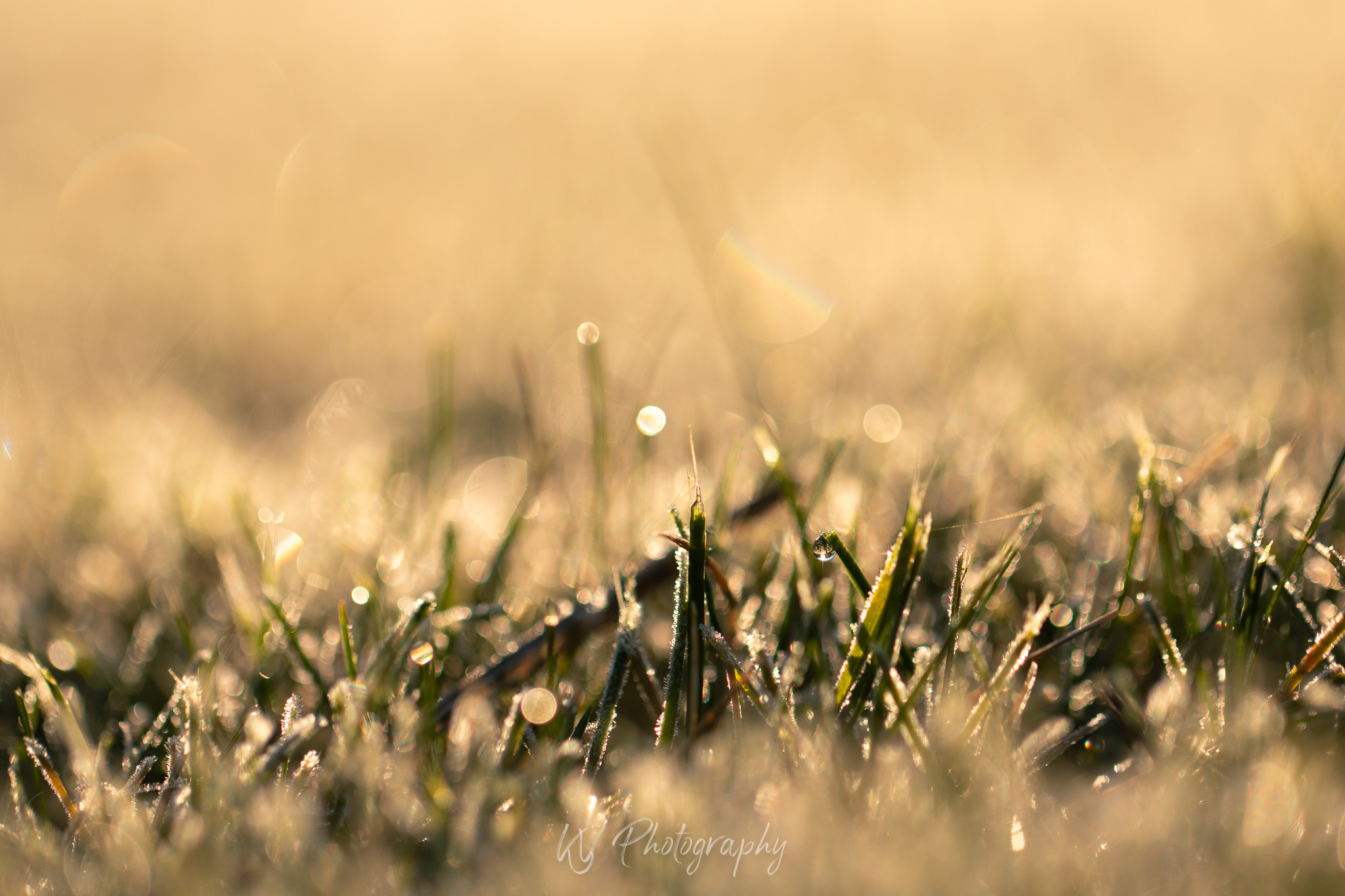 Gras, ijs en de zon met zijn gouden uurtje. Liggend op je buik in het ijs en deze druppel zien. Waar de zo'n prachtig in schijnt.