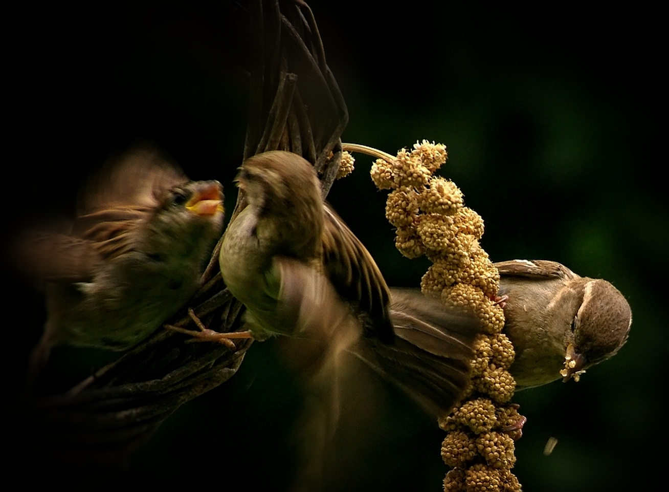 Een heel geruzie in de tuin om van de gierstzaadjes te kunnen eten.