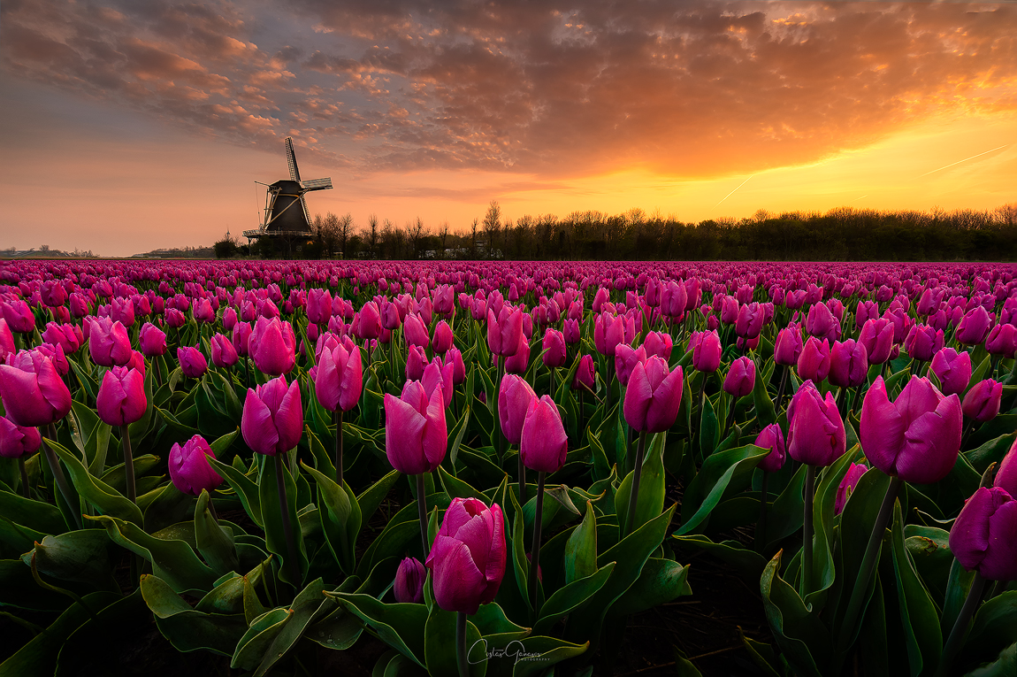 Amazing sunrise between the purple tulips