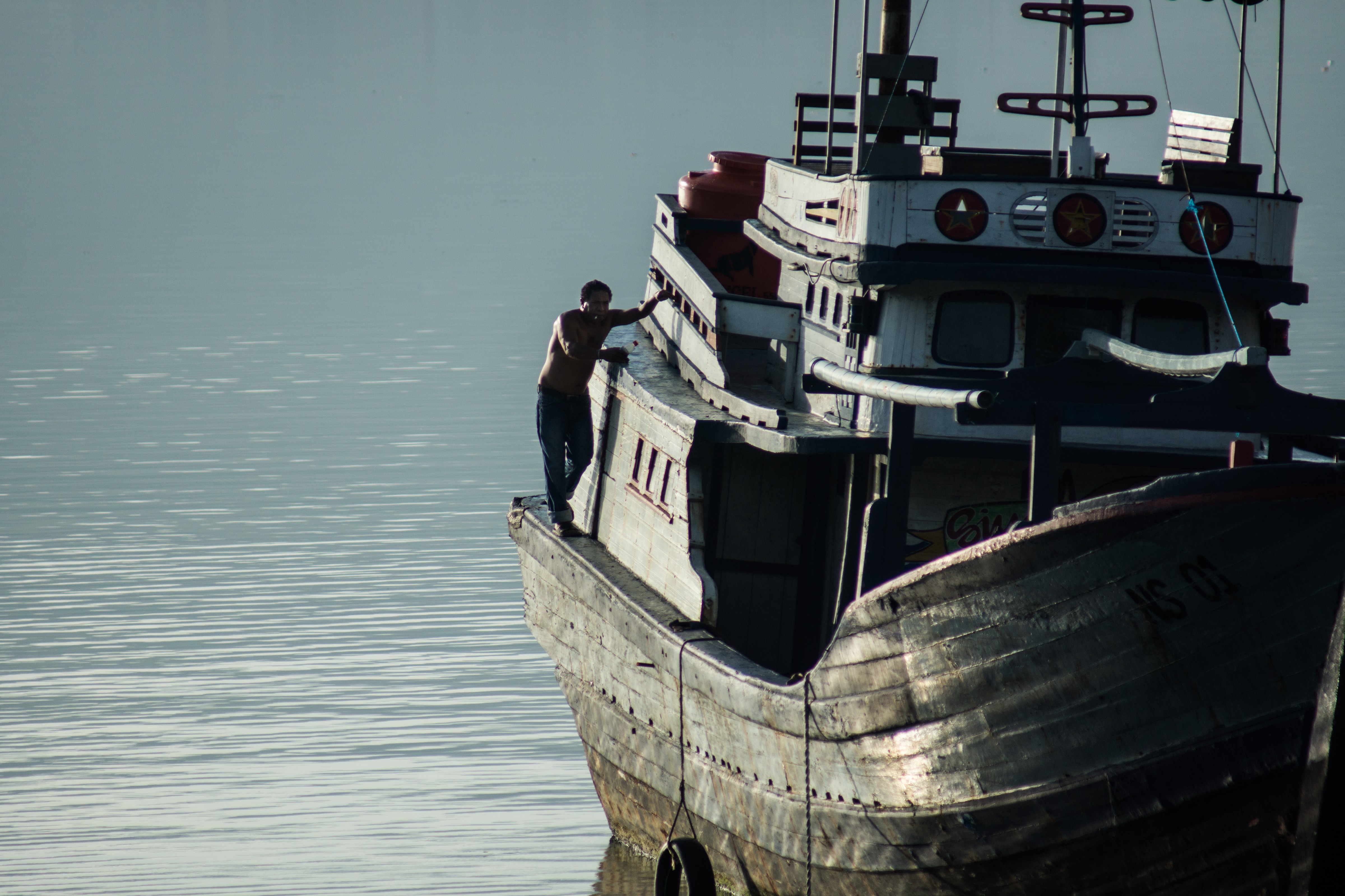 Photo a man who is living on abandoned ferry boats in Ambon.