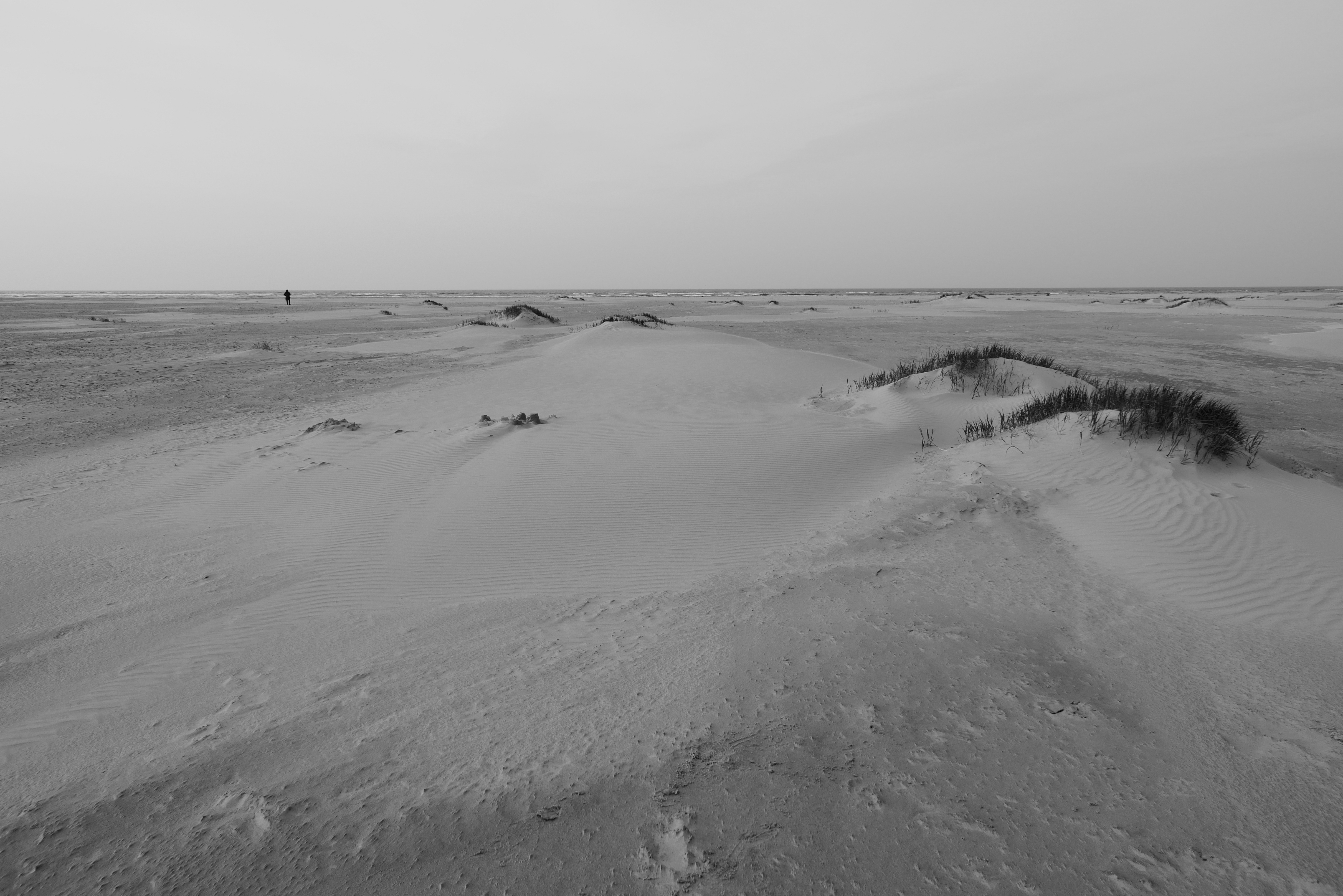 Kust van Ameland met in de verte een wandelaar.