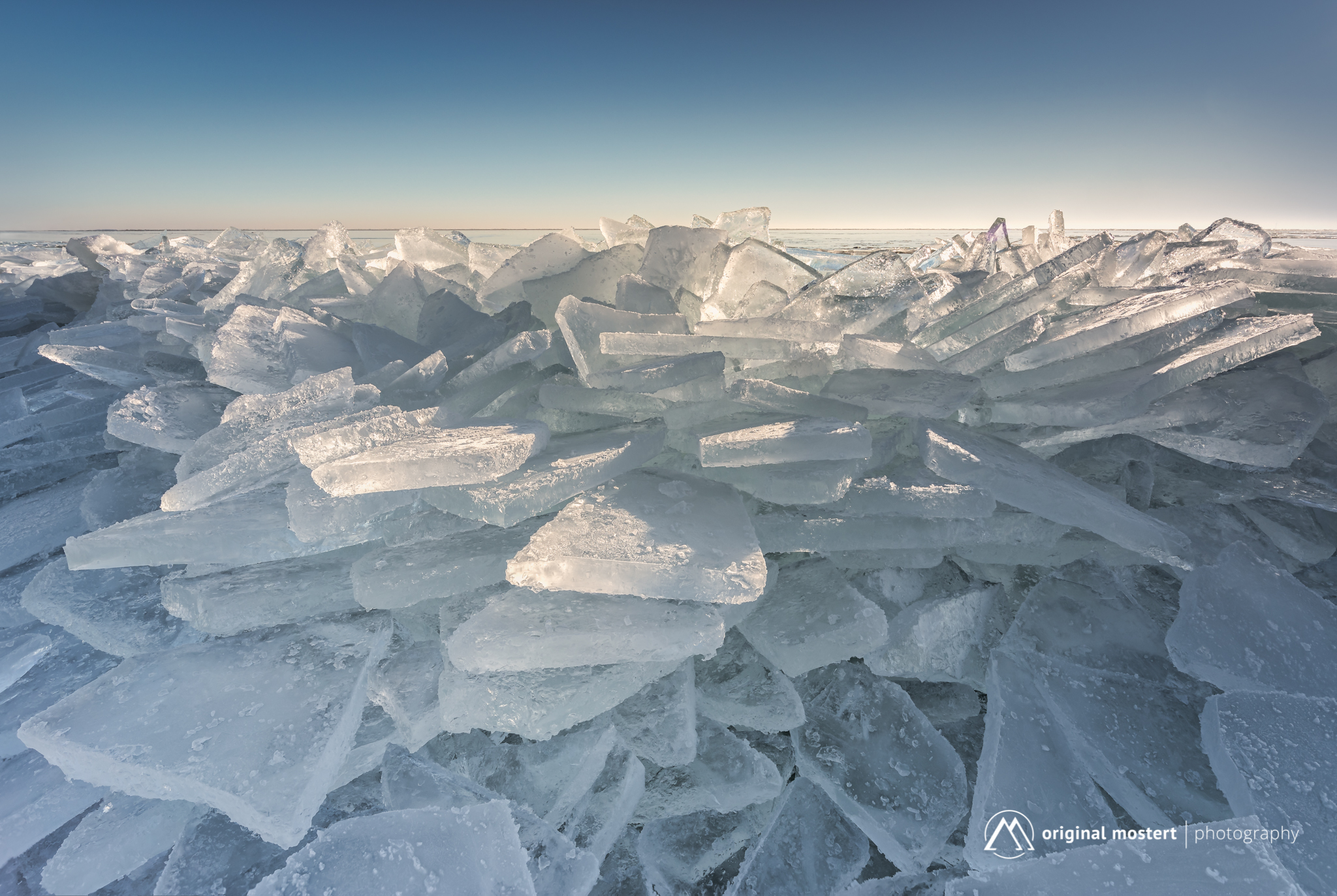 Kruiend ijs tijdens de zonsopkomst aan het Markermeer. Het Markermeer is een meer in Nederland, gelegen tussen Noord-Holland en Flevoland. Aan de noordoostelijke zijde grenst het aan het IJsselmeer, waarvan het eigenlijk het zuidwestelijk compartiment vormt, door een dijk daarvan afgescheiden.