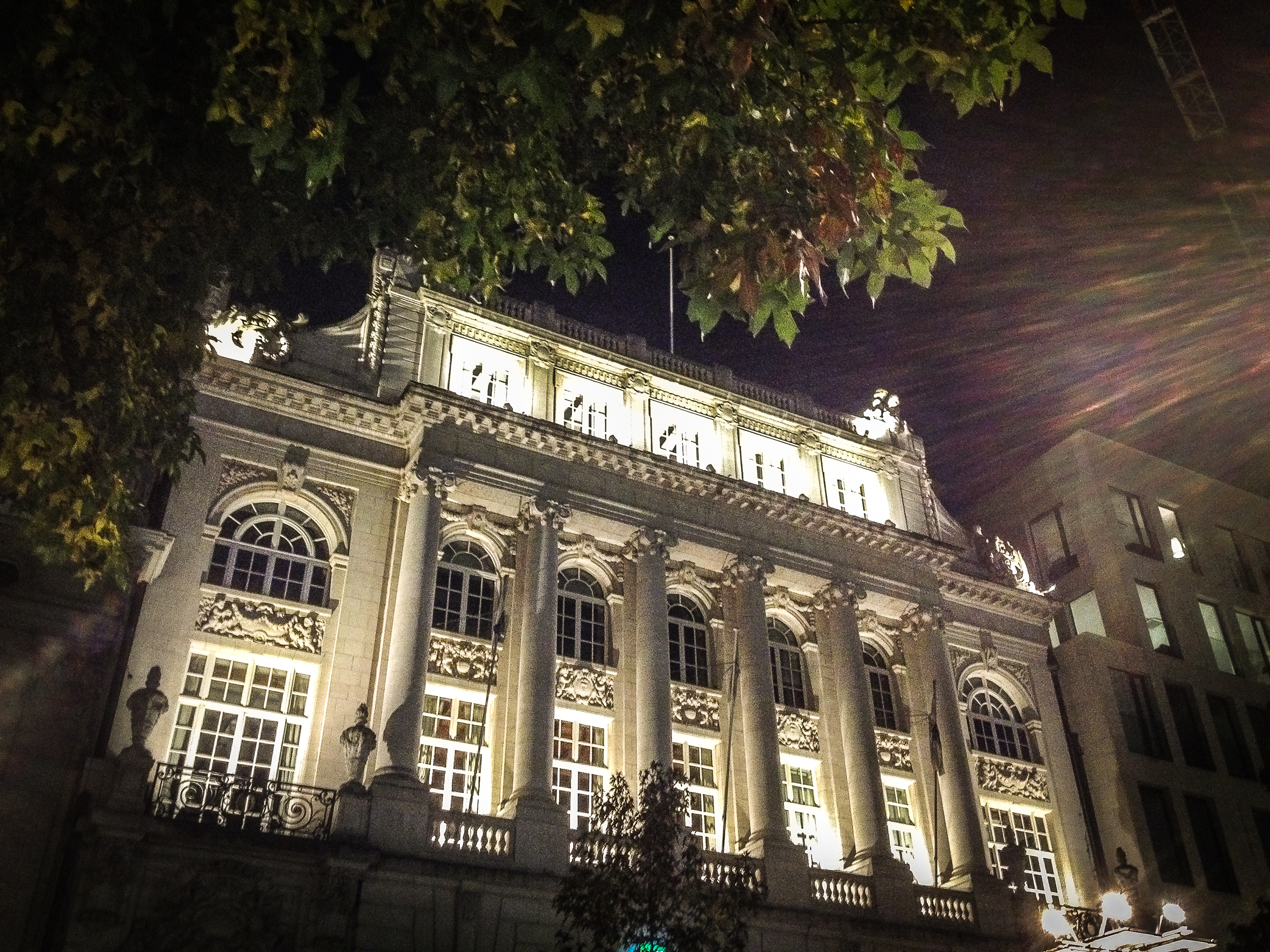 Wandeling in late avond. Prachtige gebouw met rechts lichtinval van de straat verlichting.