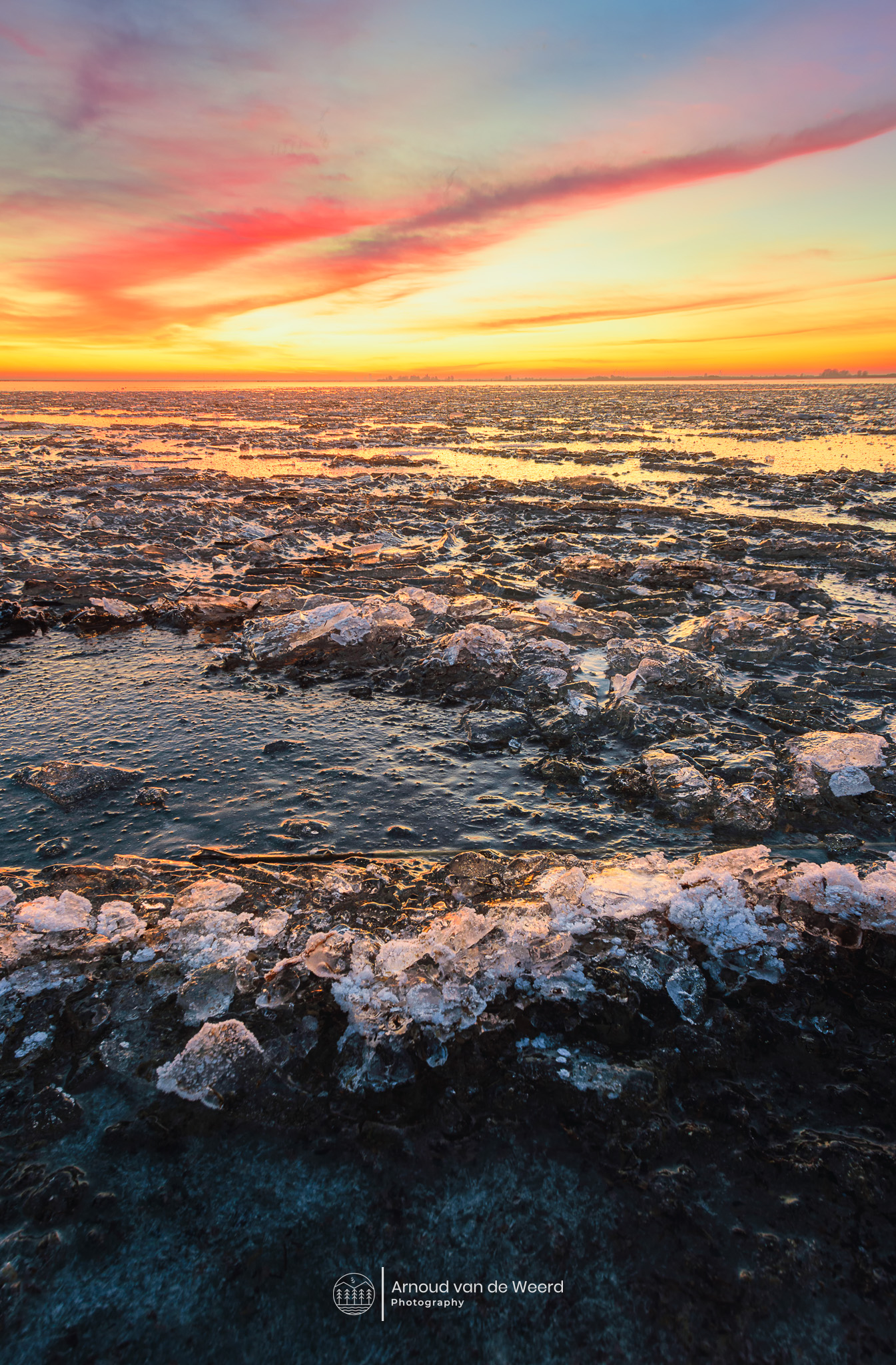 Prachtige winterse zonsopkomst aan de Gouwzee vanochtend! De ijsformaties voelen bijna on-Nederlands aan en natuurlijk hadden we geluk met spetterende kleuren in de lucht.