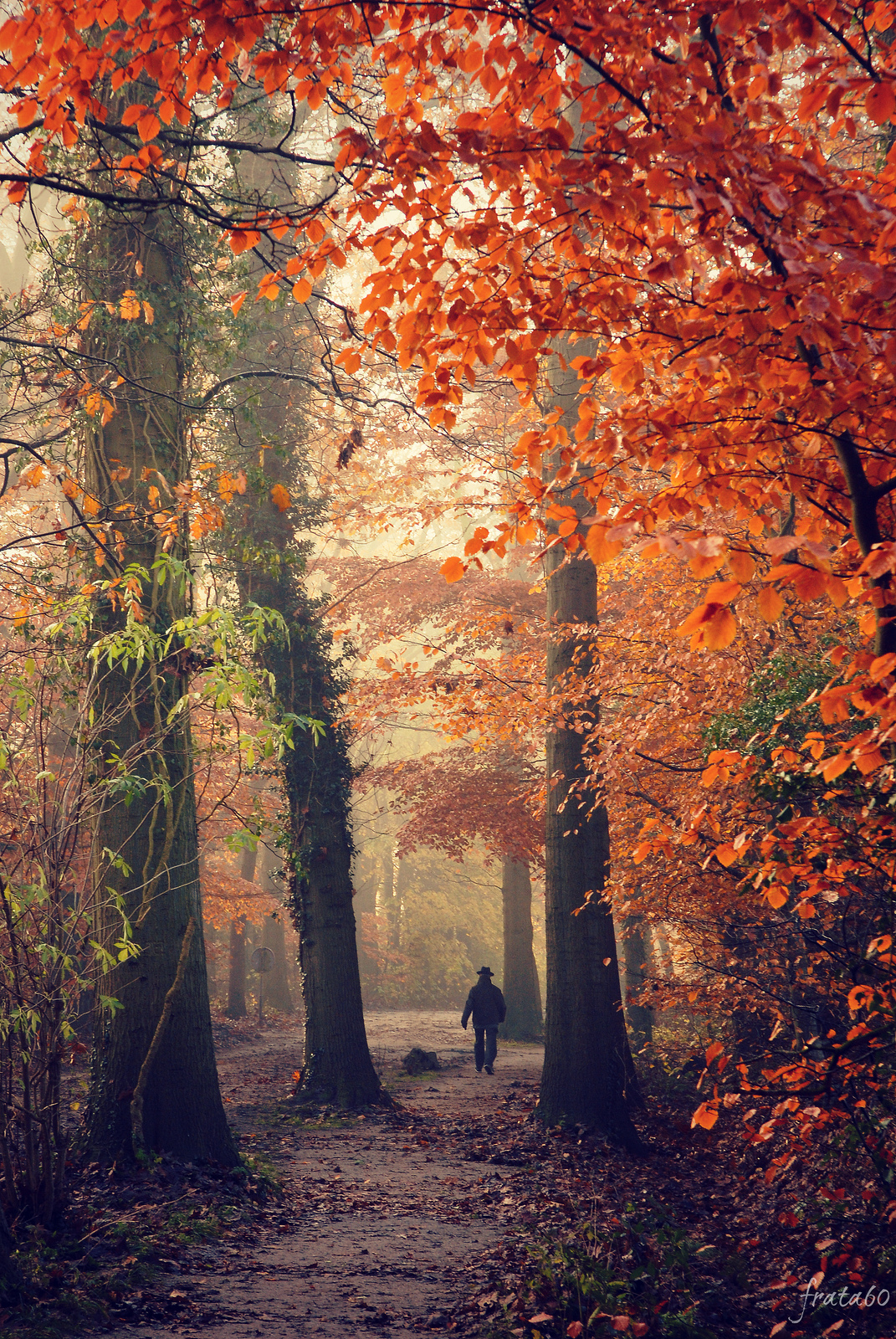 Deze man met hoed maakte een herfstwandeling door het landgoed Vosbergen in Eelde. Toen hij me voorbij liep en ik hem nakeek, zag ik dat hij werd omringd door een palet aan herfstkleuren.