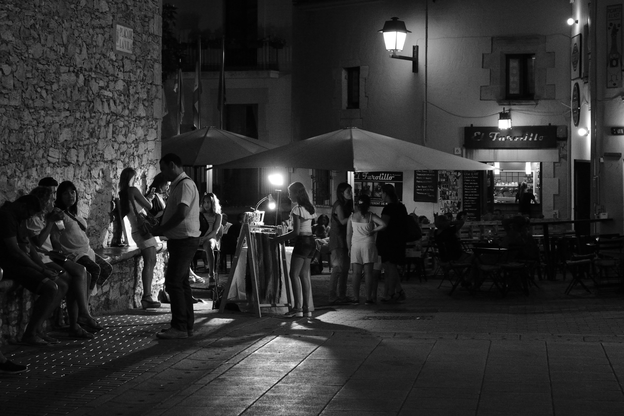 Rondom een kraampje staan en zitten mensen. Inmiddels is het donker geworden. Café's zijn druk met hun gasten op het terras.
