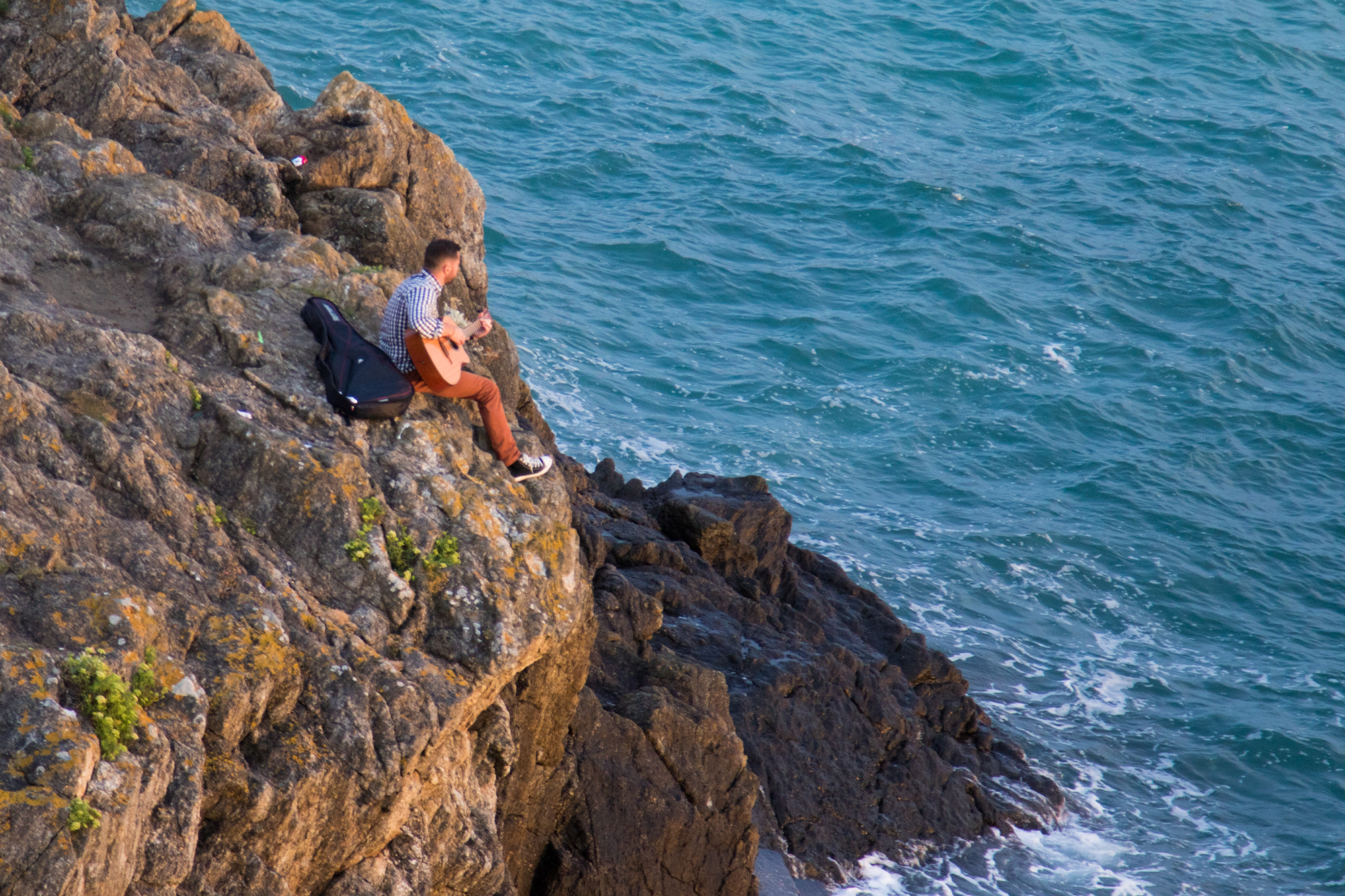 Je hoort de klotsende golven beuken op de rotsen. Machtig mooi denk je dan. Natuur doet zijn ding. En dan ineens zachtjes gepingel van iemand op een gitaar. Vingers dansen melodisch over de snaren van zijn gitaar al kijkende naar de bijna op ritme gaande golven. Een avontuur waar je relaxed van wordt tijdens het kijken naar de golven die uiteen spatten op de rotsen. Een geweldige ervaring.