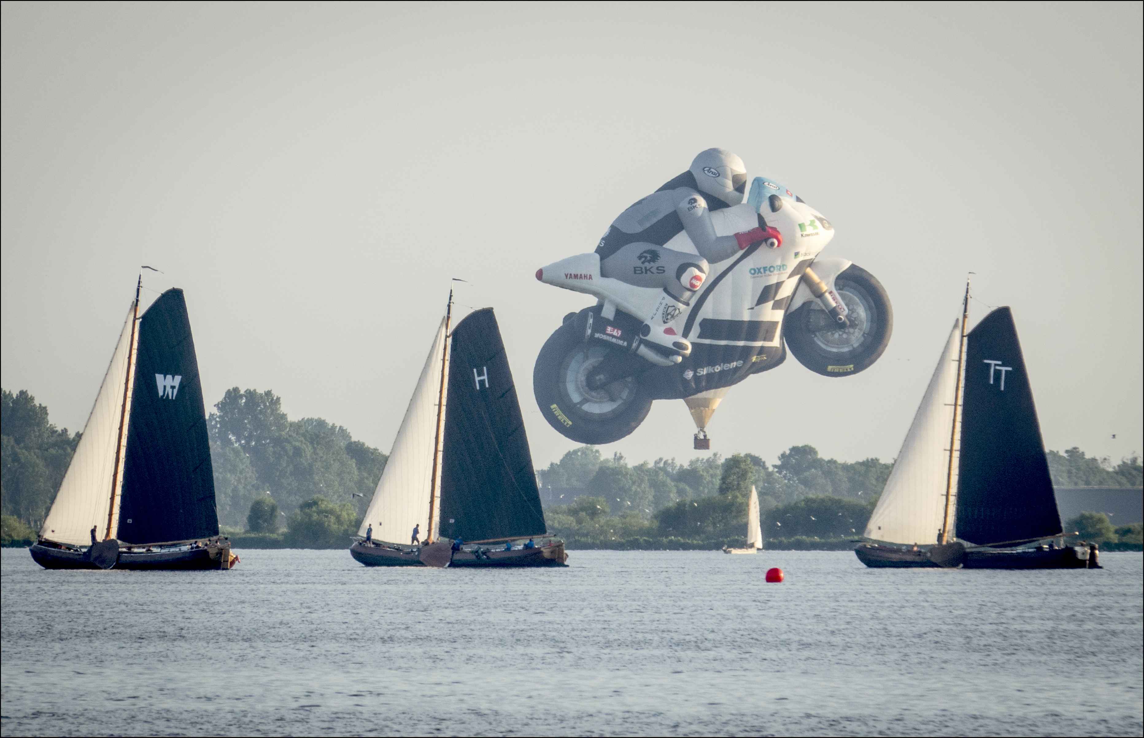 Hier komen op verbluffende wijze oude techniek en nieuwe technieken samen. De oude techniek is het varen van een prachtig skutsje en die ontmoet dan op het water de luchtvaart met als afbeelding het gemotoriseerde alleen ditmaal in de vorm van een ballon.
