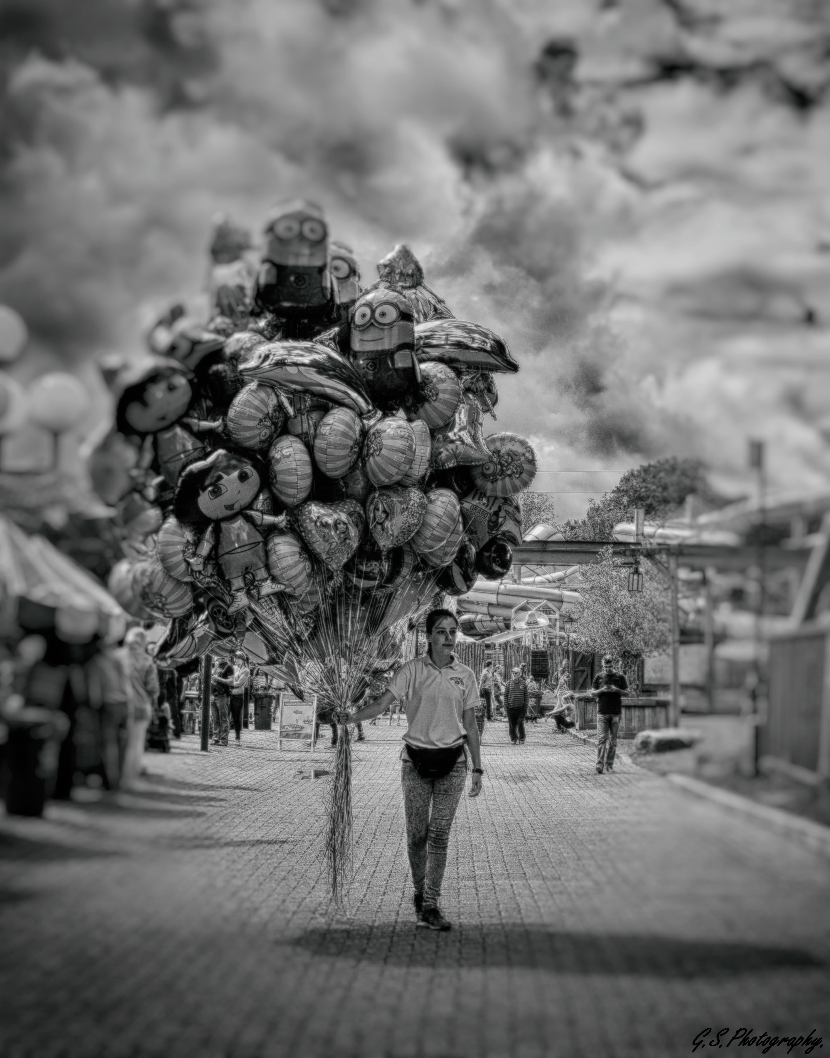 Een meisje die ballonnen verkoop in Slagharen.