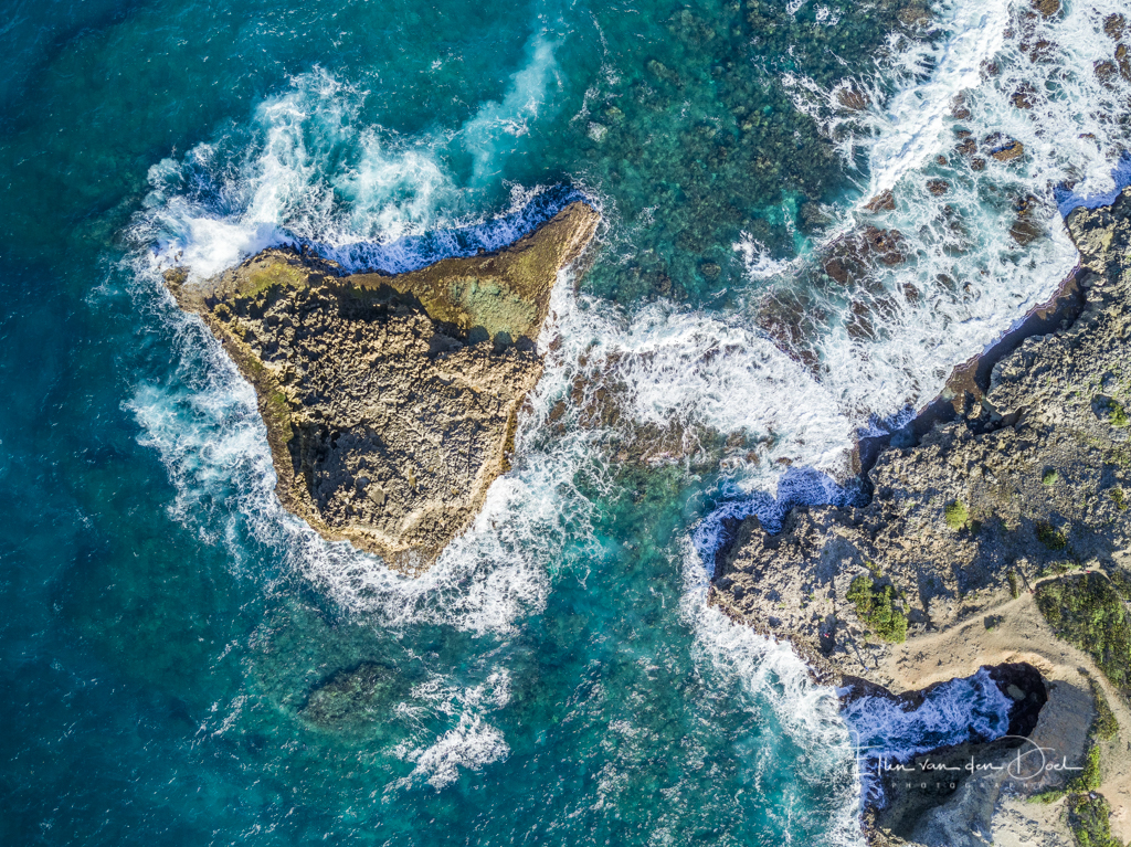 Dit is de ruige kustlijn van het oosten van het eiland Guadeloupe. Prachtig om te zien van bovenaf met al die vormen en kleuren.
