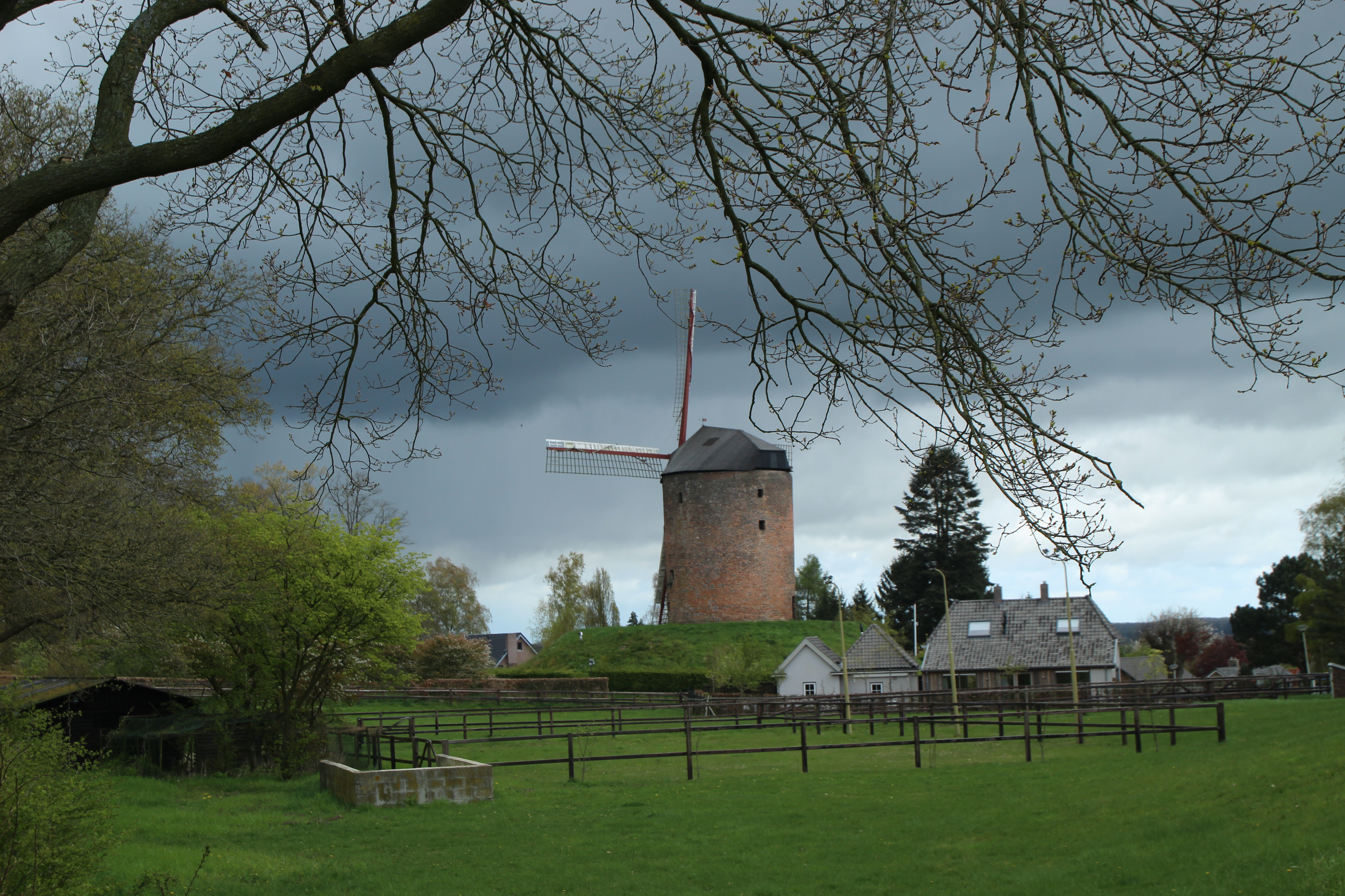 Onder een dreigende aprillucht staat de oudste molen van Nederland (Zeddam) te wachten op de zomer.