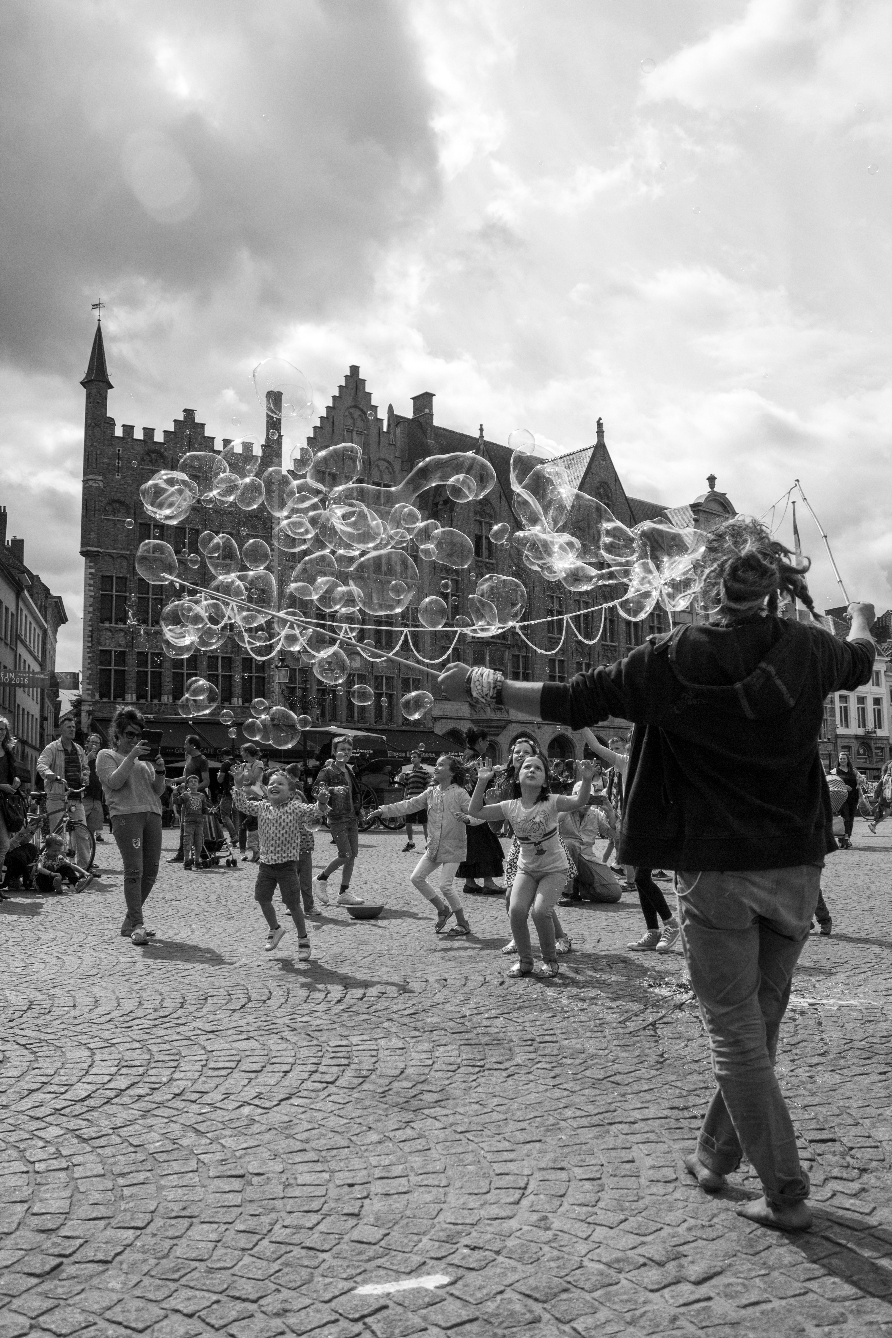 Een bellenblazer entertaint de toevallig aanwezige kinderen op het marktplein in Brugge.