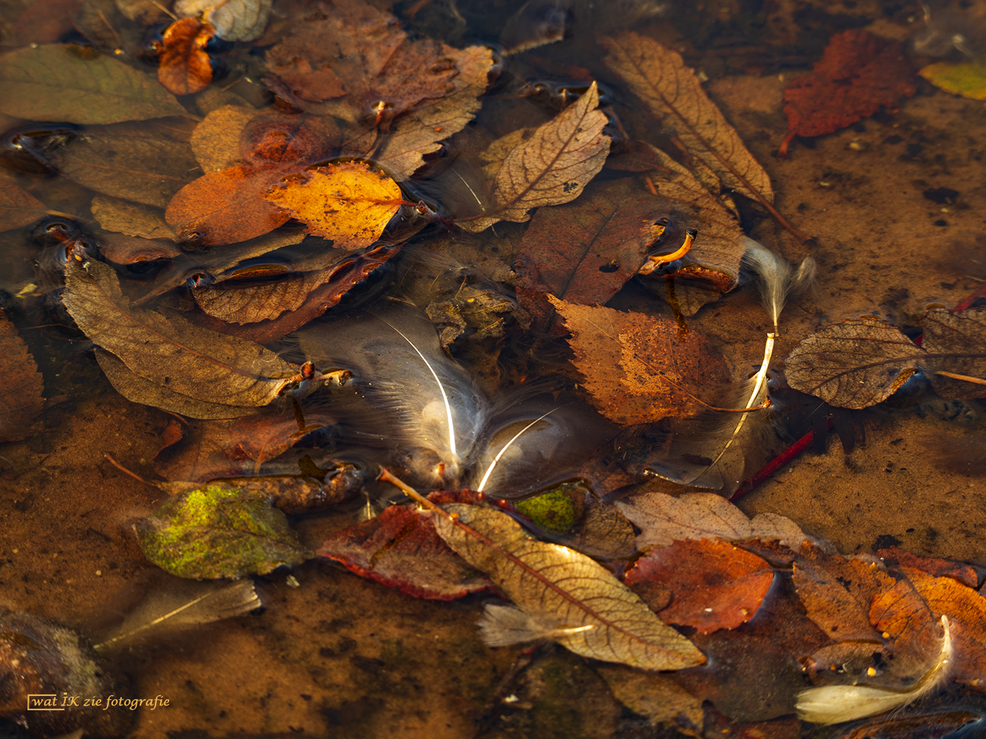Een vennetje in het Bargerveen (Drenthe), met daarin prachtig gekleurde bladeren en een enkel veertje . . . een plaatje om te zien!!
