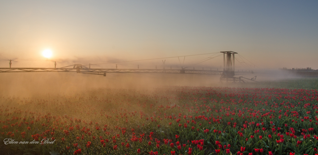 De tulpen worden beregend tijdens het ondergaande zonnetje op Goeree-Overflakkee.