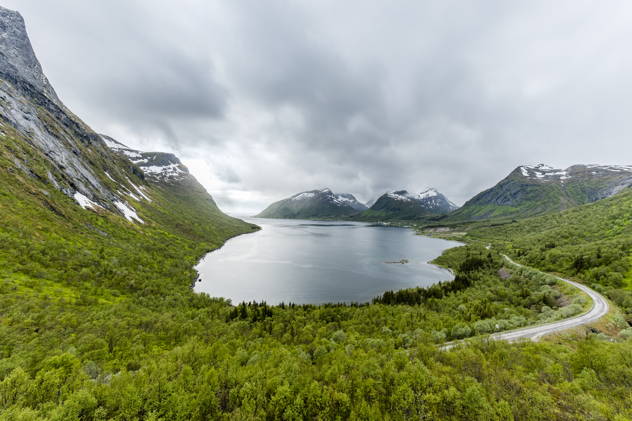 Noorwegen kent langs de kust verschillende markante kunstwerken waaronder een aantal zeer fraaie bouwwerken die als uitzichtpunt dienst doen. Bergsbotn is er één van. Vanaf dat punt is deze foto gemaakt. Dat het weer erg wisselvallig is bleek uit het feit dat we ca. 10 minuten in een sneeuwstorm onze weg naar beneden vervolgden.