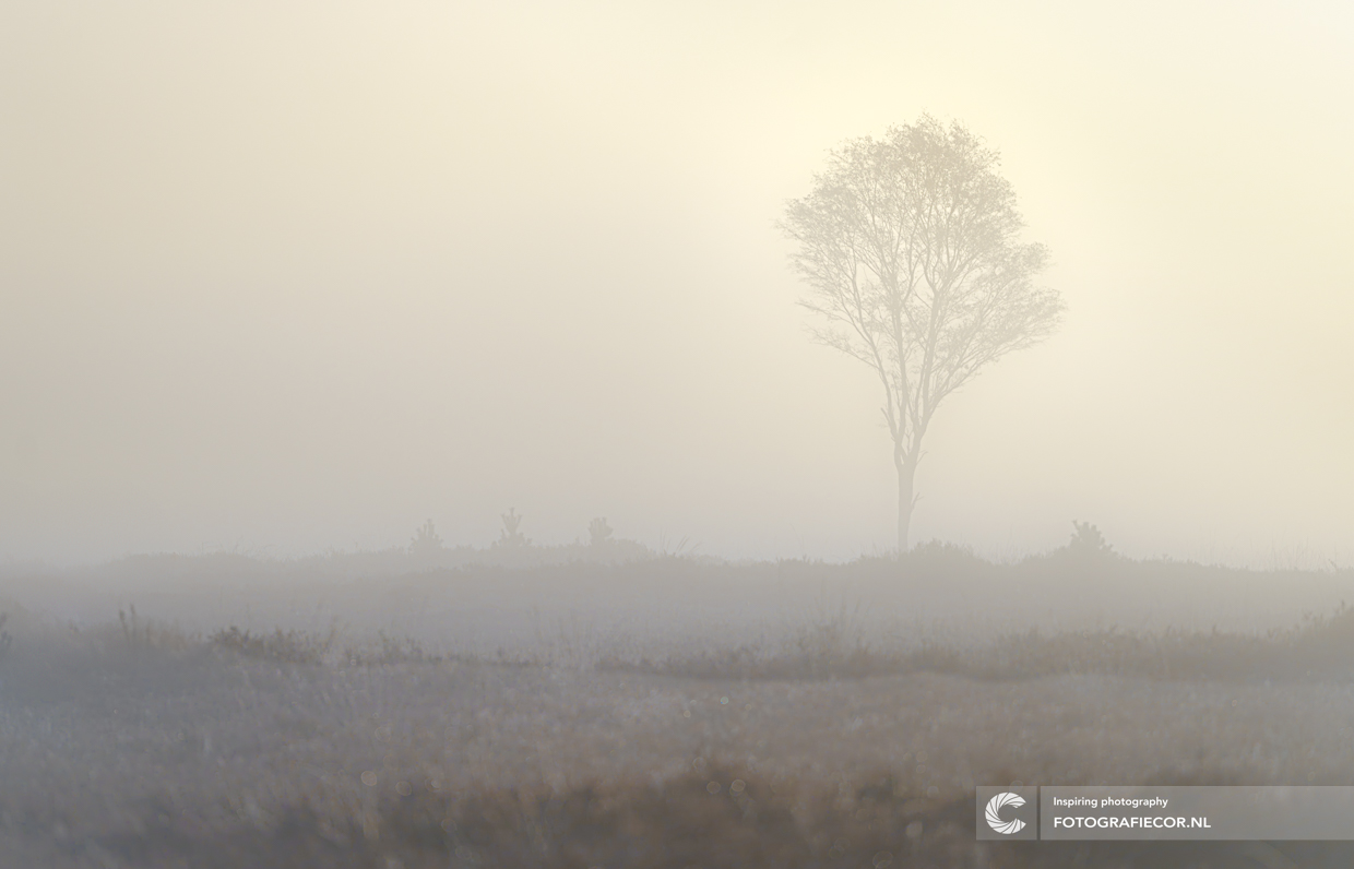 Dichte nevel of ochtendmist drukt haar stempel op het landschap en bedekt de wereld in een dikke sluier van mystiek. De zon komt langzaam op en schijnt met haar eerste lichtstralen over de verlaten heide. De contouren van een grote, fier en rechtopstaande berkenboom, doemen langzaam op uit de mist. Verlaten en eenzaam staat die in nevelen gehuld en word langzaam zichtbaar tegen de schitterende pastelkleuren van de zonsopkomst.