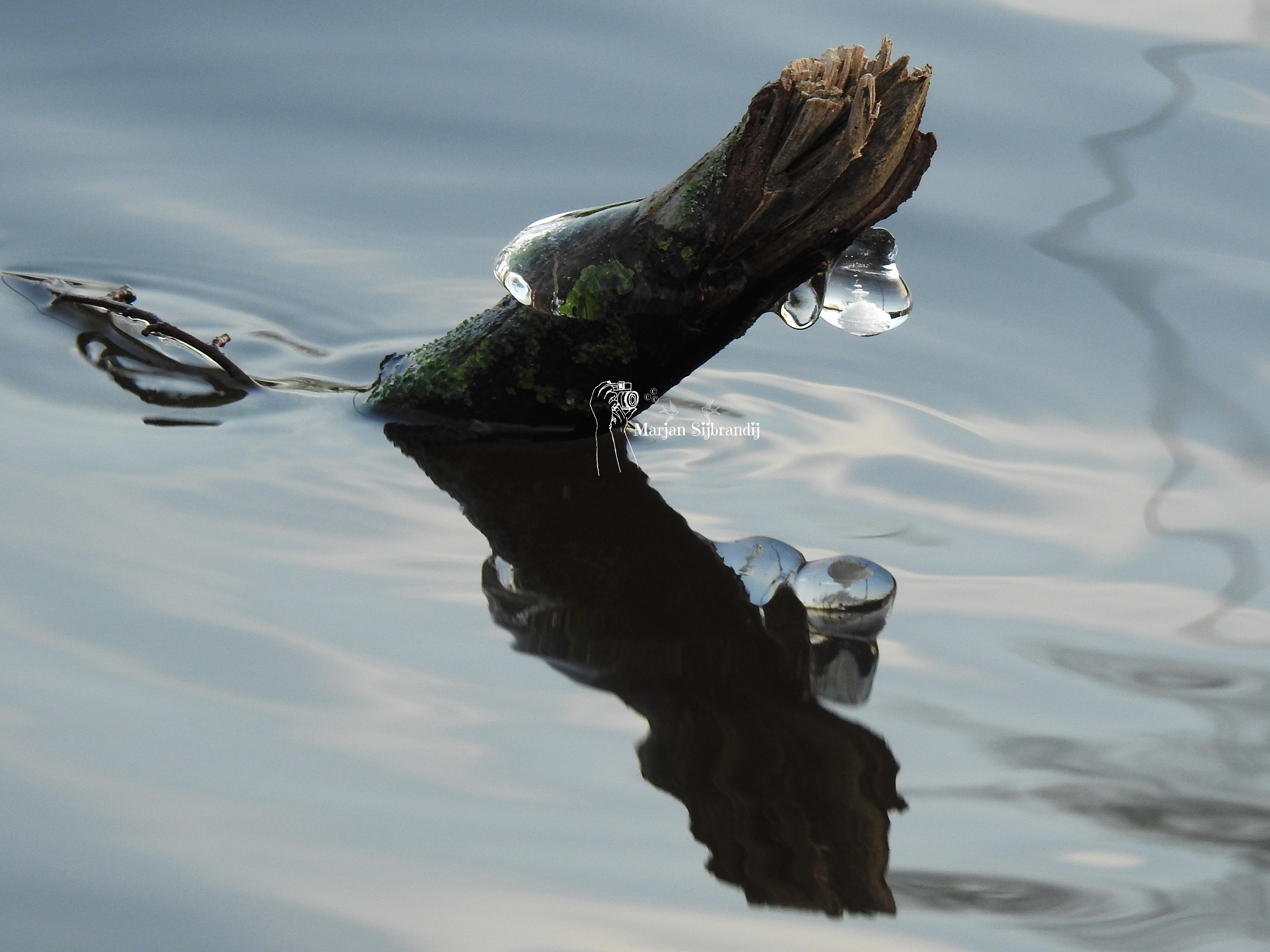 Vanochtend even op de fiets naar het Slotermeer nabij Balk (Friesland) geweest. Prachtig bevroren water op een boomstam met een mooie spiegeling.