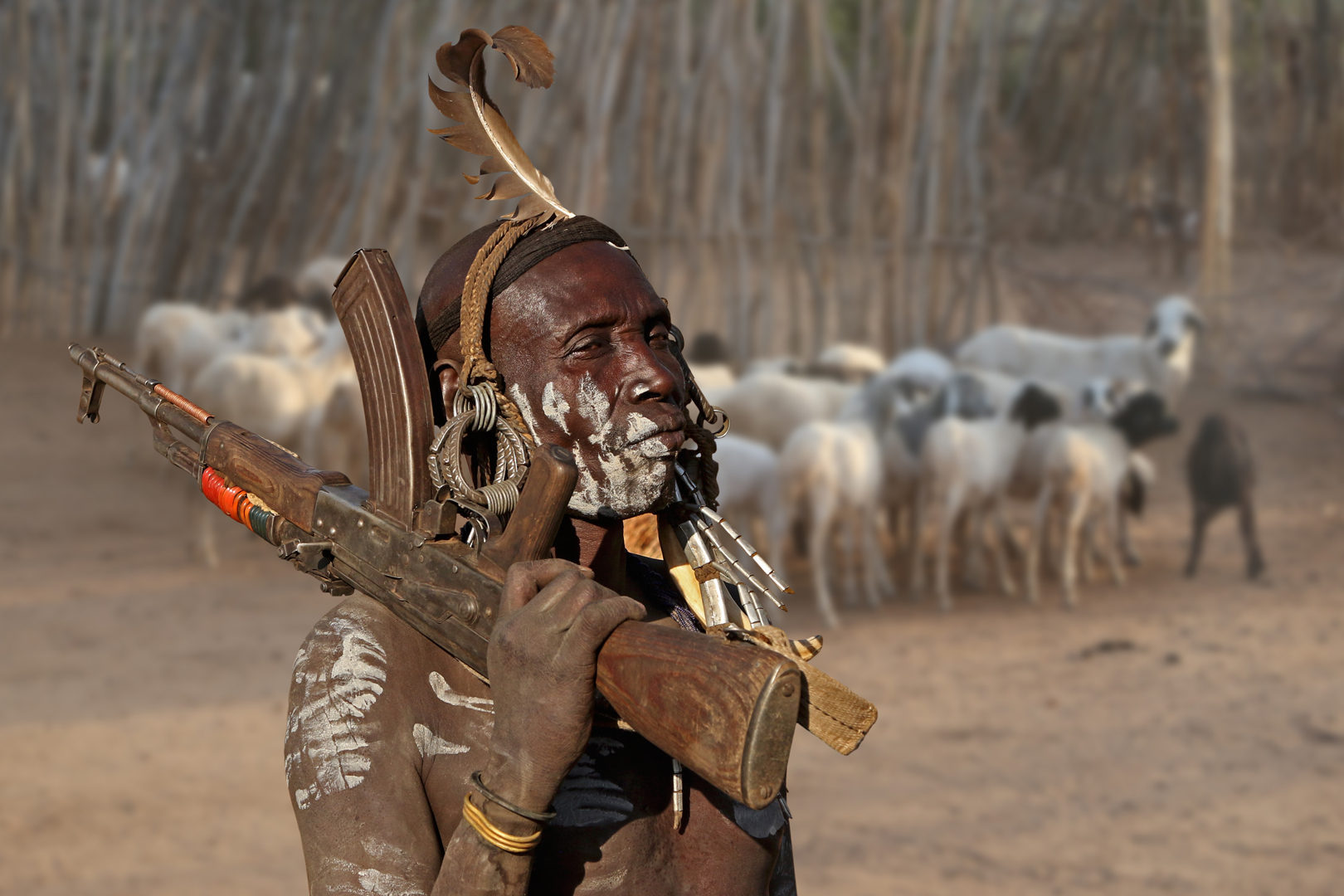 Bewaker in dorp (Zuid Ethiopië)