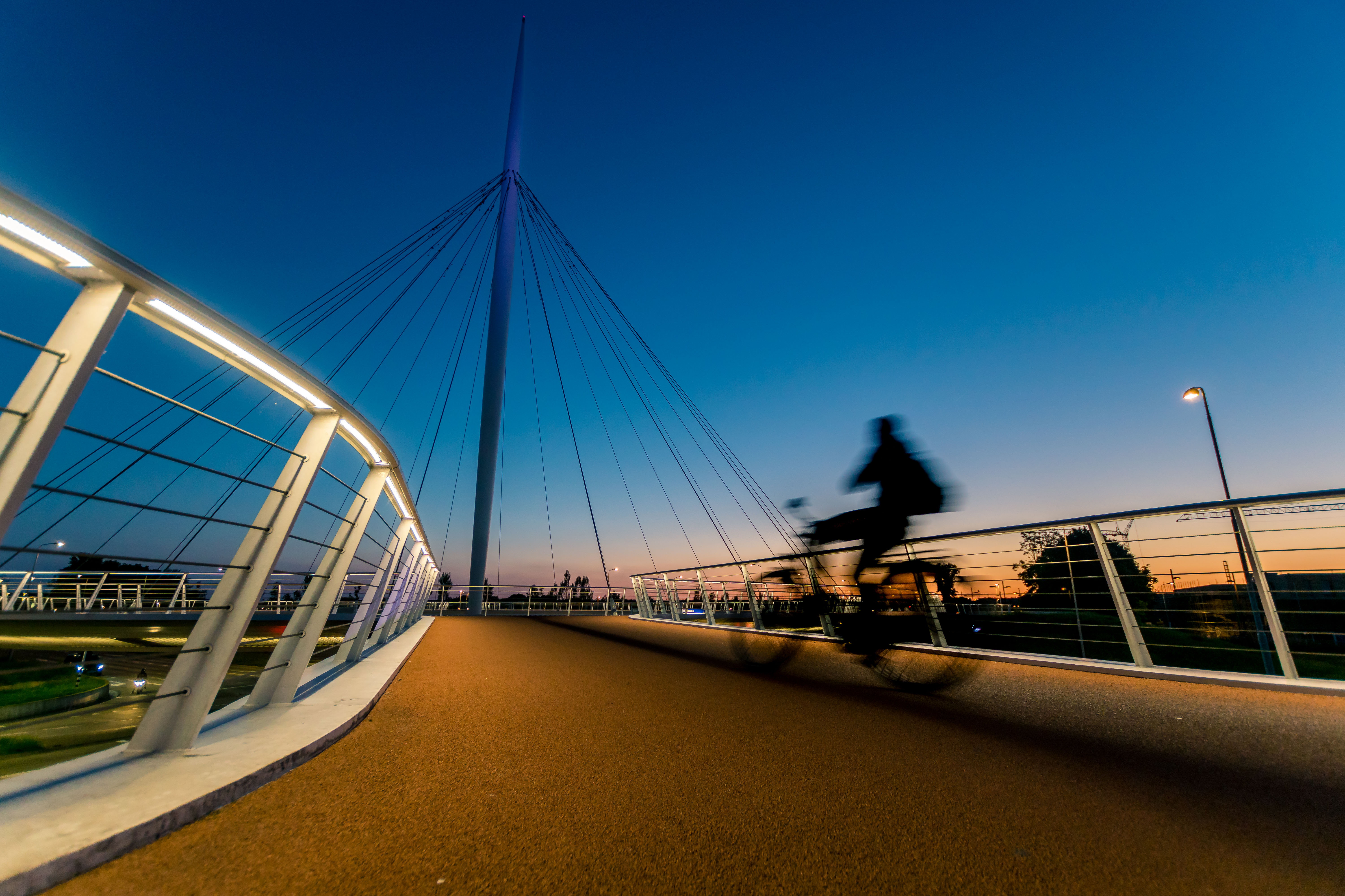 Hovenring in Veldhoven is een fietsviaduct. De berwegingsonscherpte geeft de fietser een beetje snelheid en maakt de foto af.