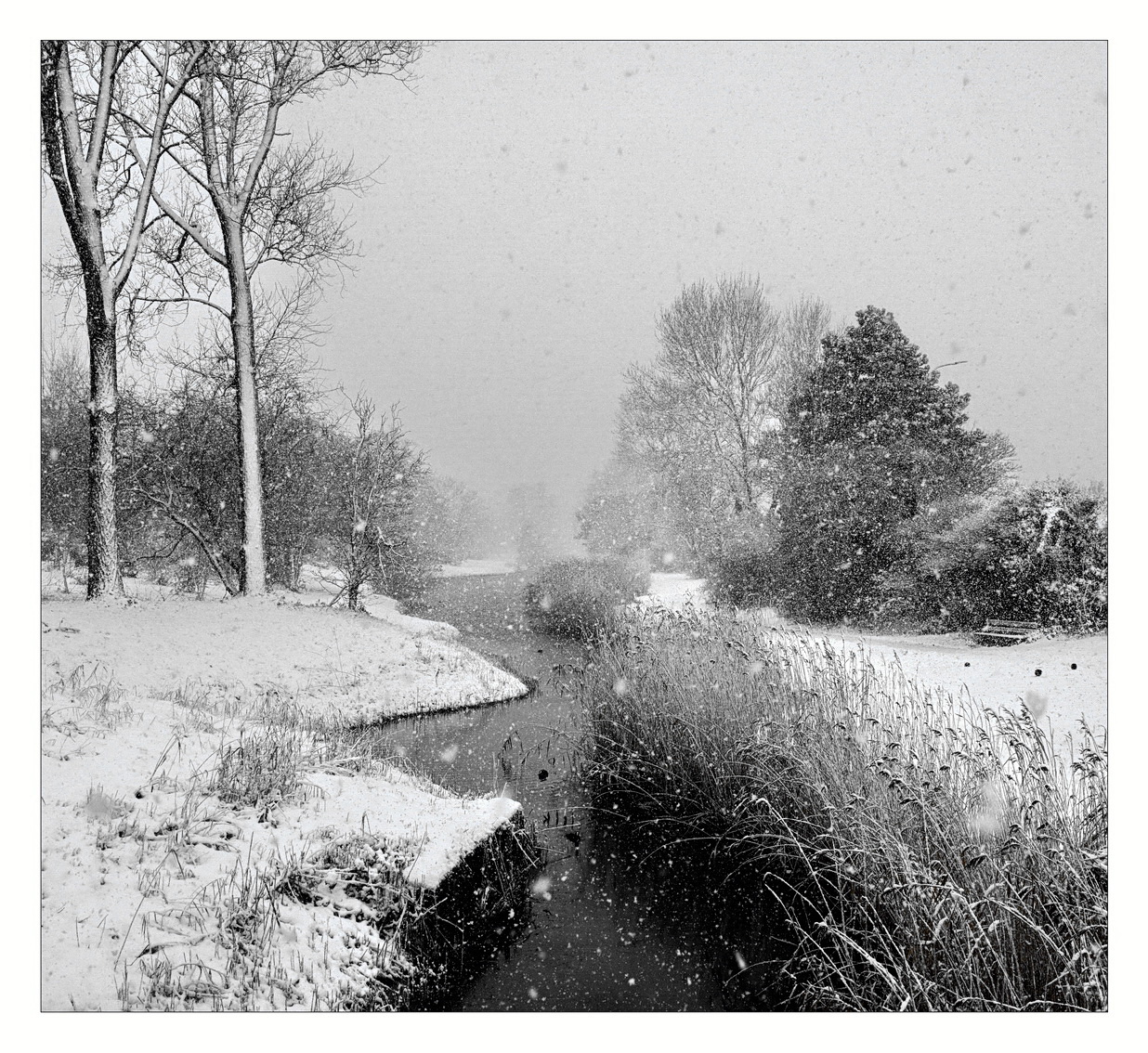 Eergisteren tijdens zware sneeuwval even naar het strand gelopen. Kwam bij de Haagse Beek en vond dit wel de moeite waard. Eigenlijk vind ik hem in kleur sprekender....
