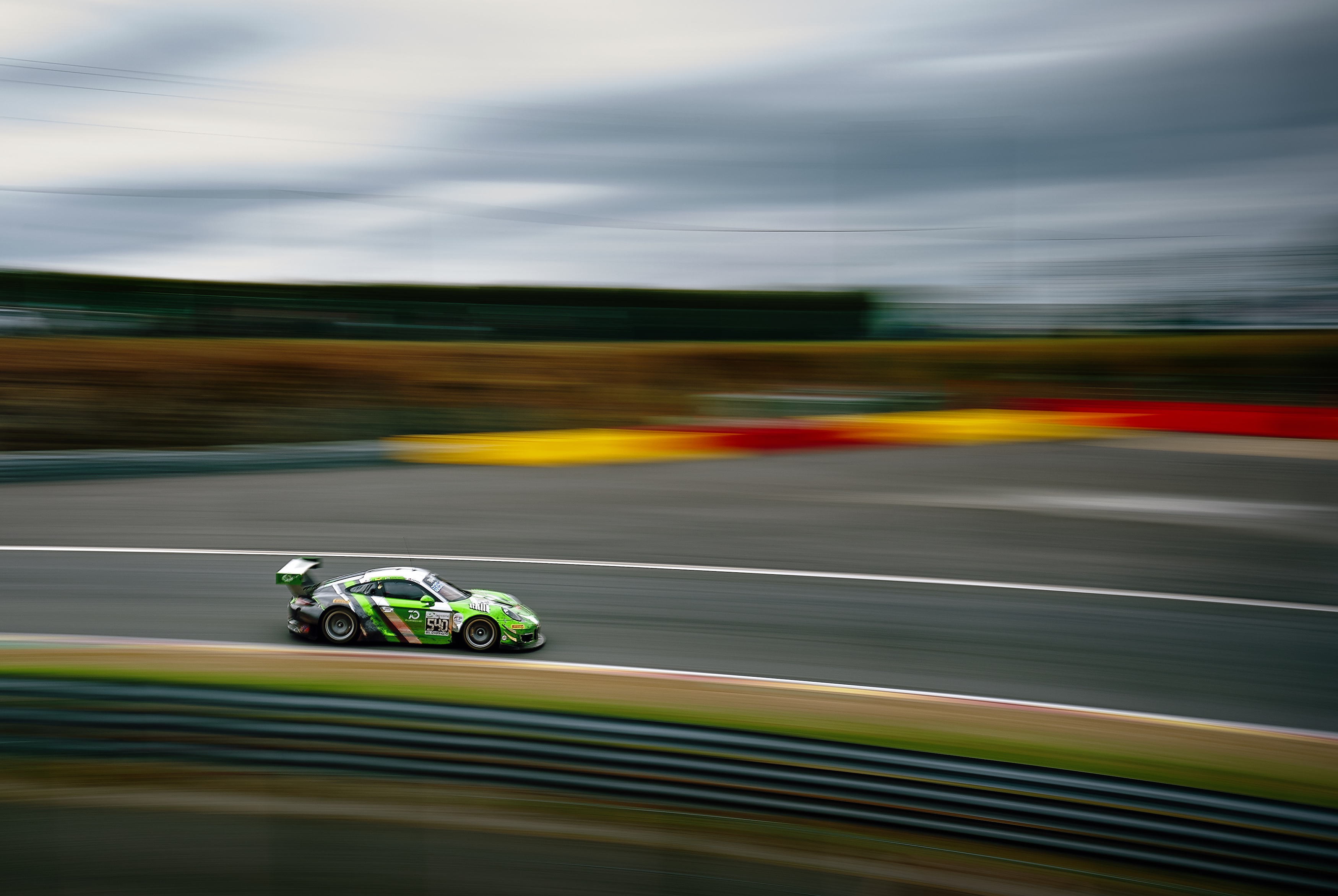 Een Porsche racewagen snijdt de bocht aan tijdens de 24u van Spa-Francorchamps.