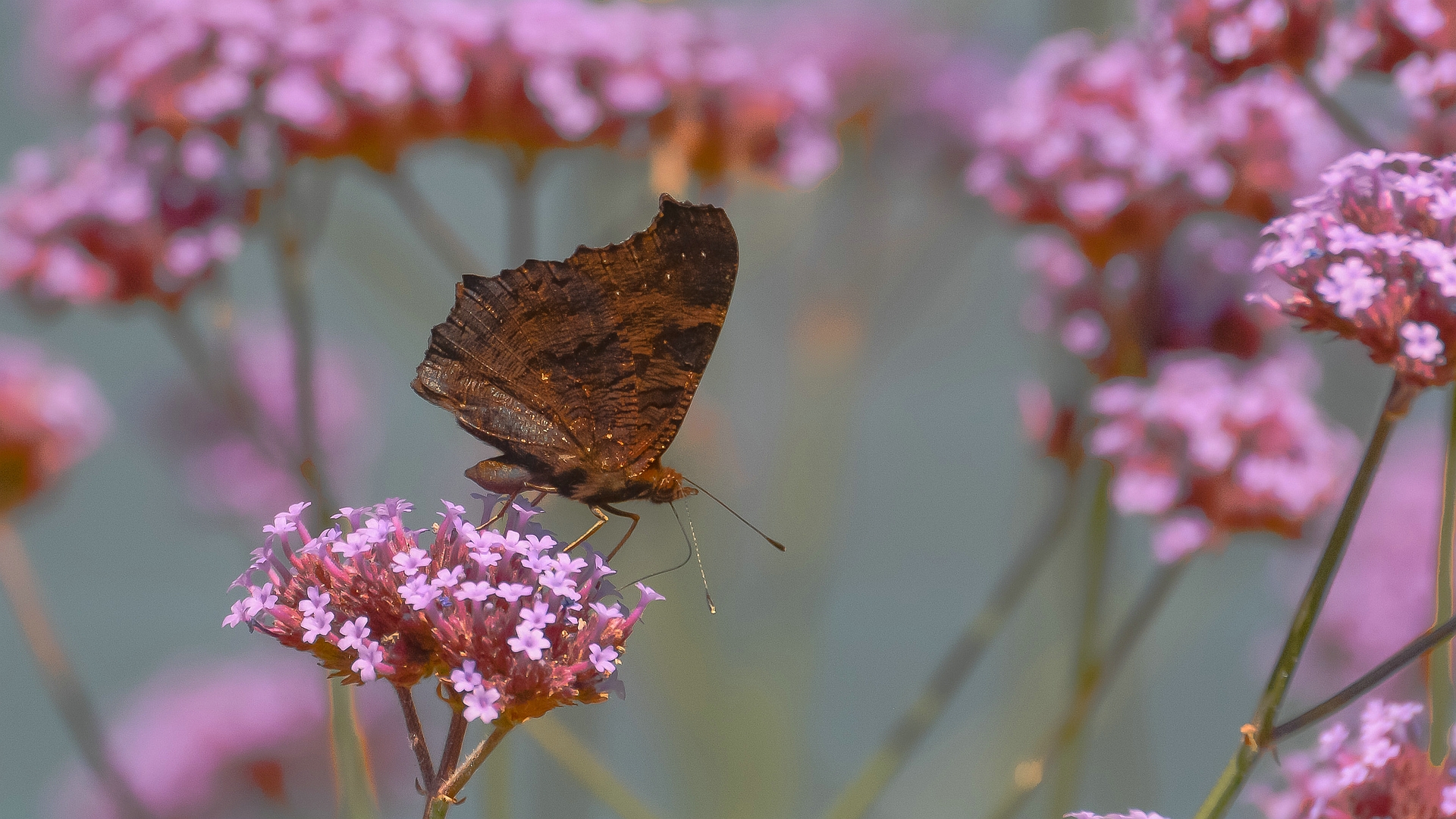 De dagpauwoog op de geliefde bloemsoort verbena ijzerhard , omdat de vlinder meer met de vleugeltjes dicht zat wilde ik er toch een blikvanger van maken en heb besloten voor focuszoon , zo krijgt de vrij donkere vlinder toch de aandacht tussen de mooie kleurtjes