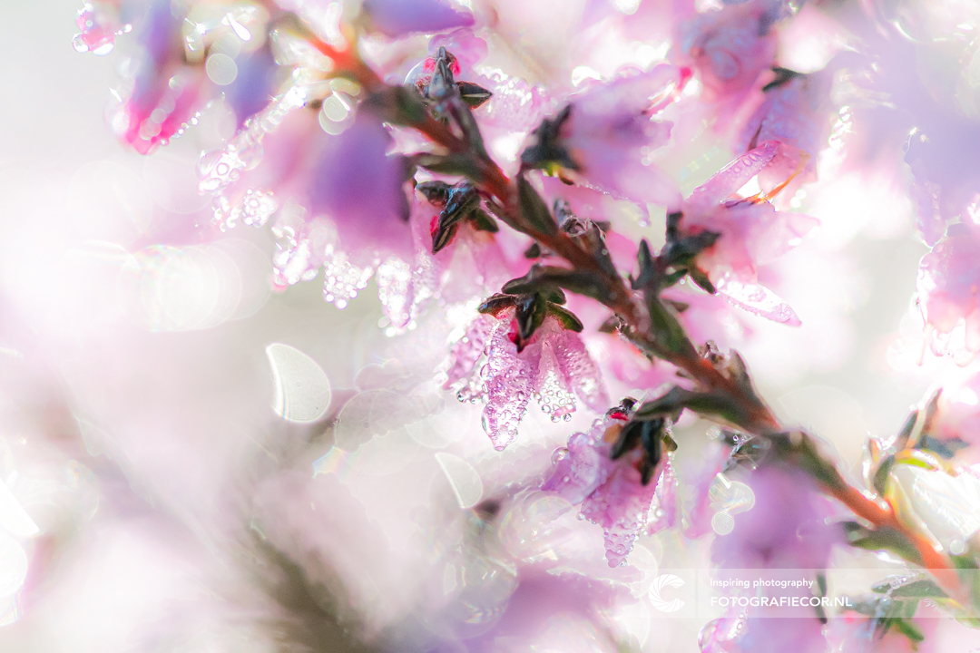 Beetje struinen met je macrolens tussen de bloeiende heide met het vroege ochtendlicht als tegenlicht gebruiken. De dauw en de waterdruppels maken het een groot glinsterende geheel met een versiering van rond stuiterend bokeh.