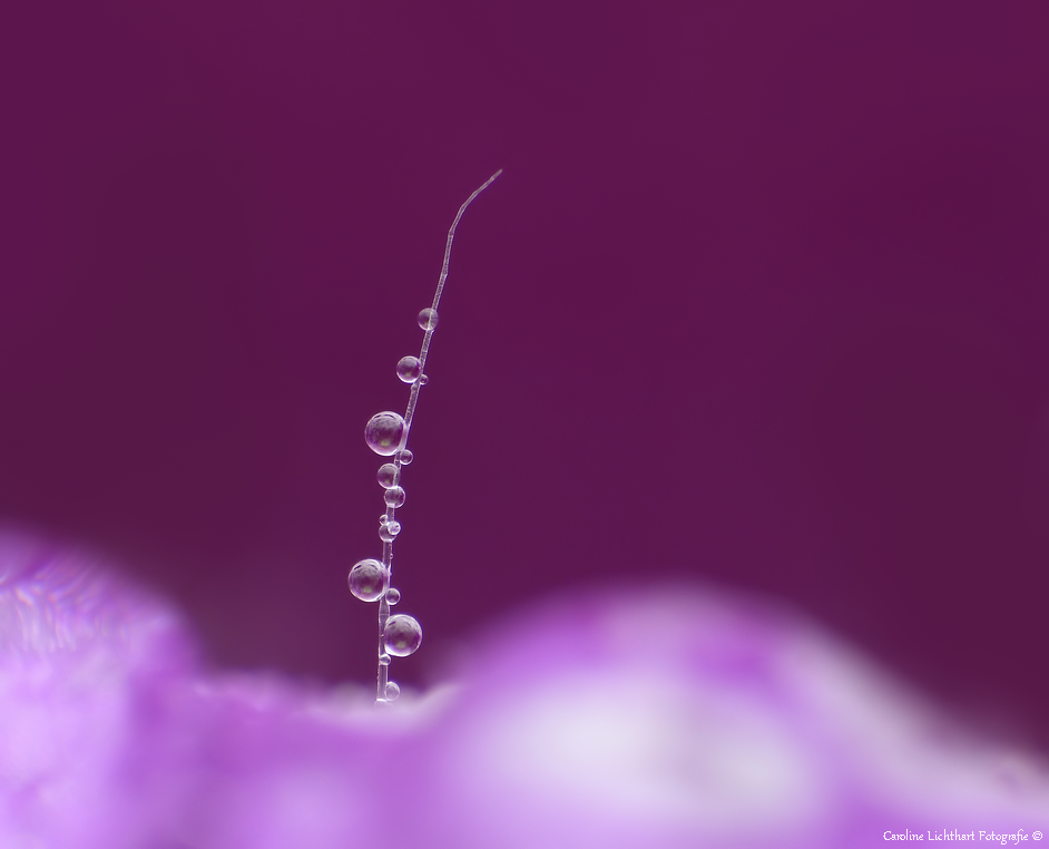 Een haartje met druppeltjes in de ingang van een bloem van Vingerhoedskruid.