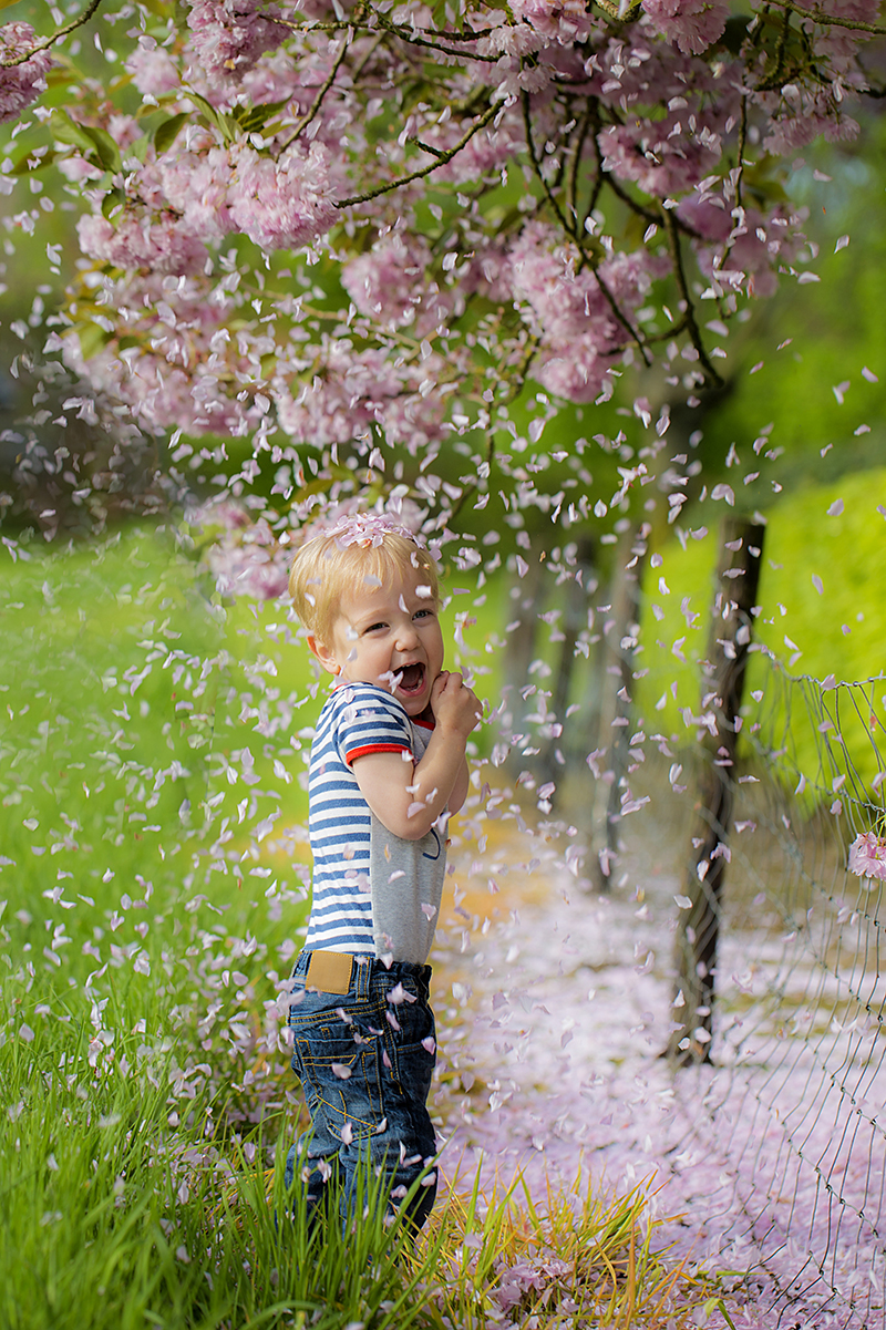 Kleie Noud onder een voorjaars bloesem regen