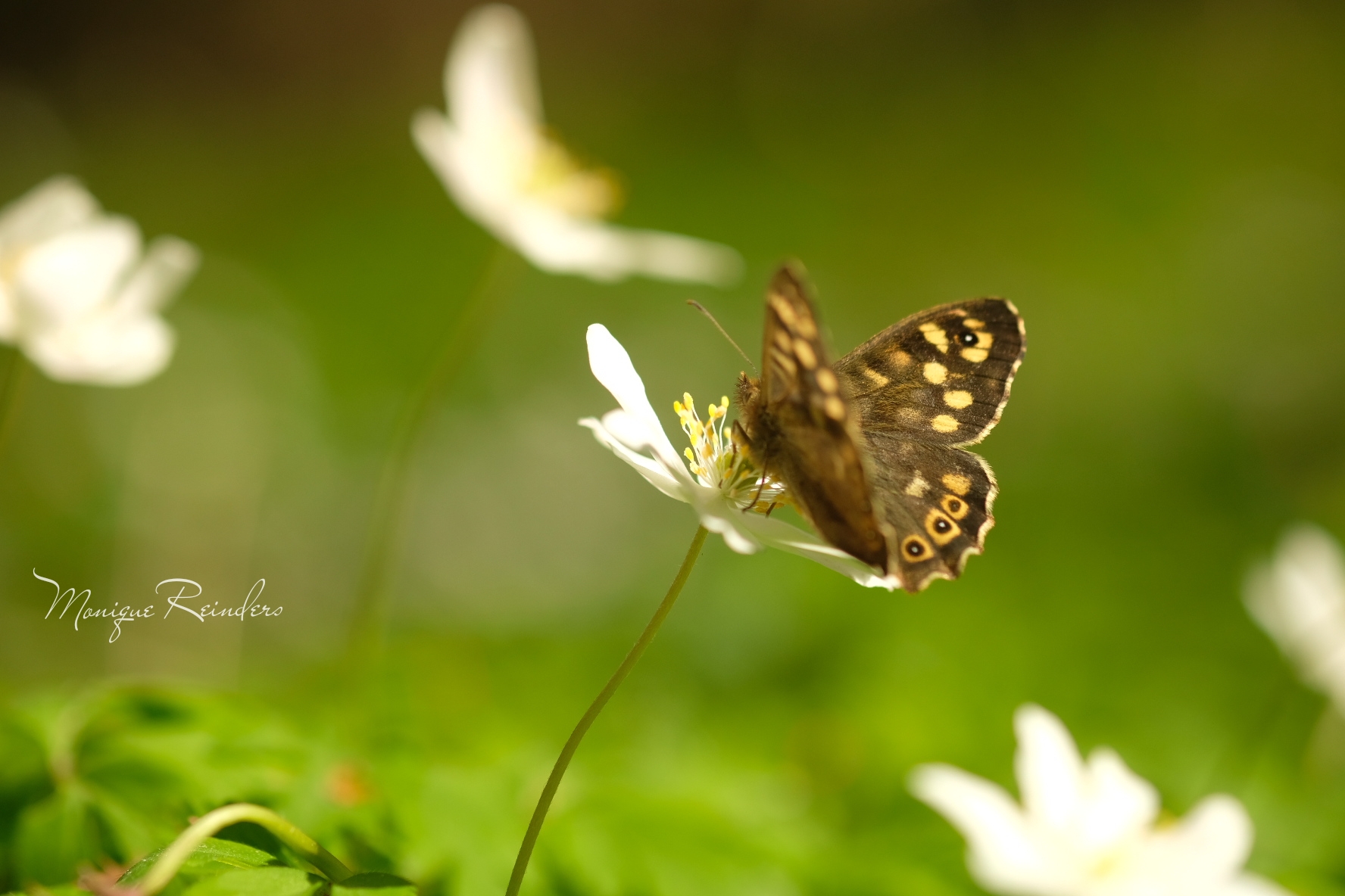 Tijdens het fotograferen van de bosanemonen streek dit zandoogje vlak naast me neer.