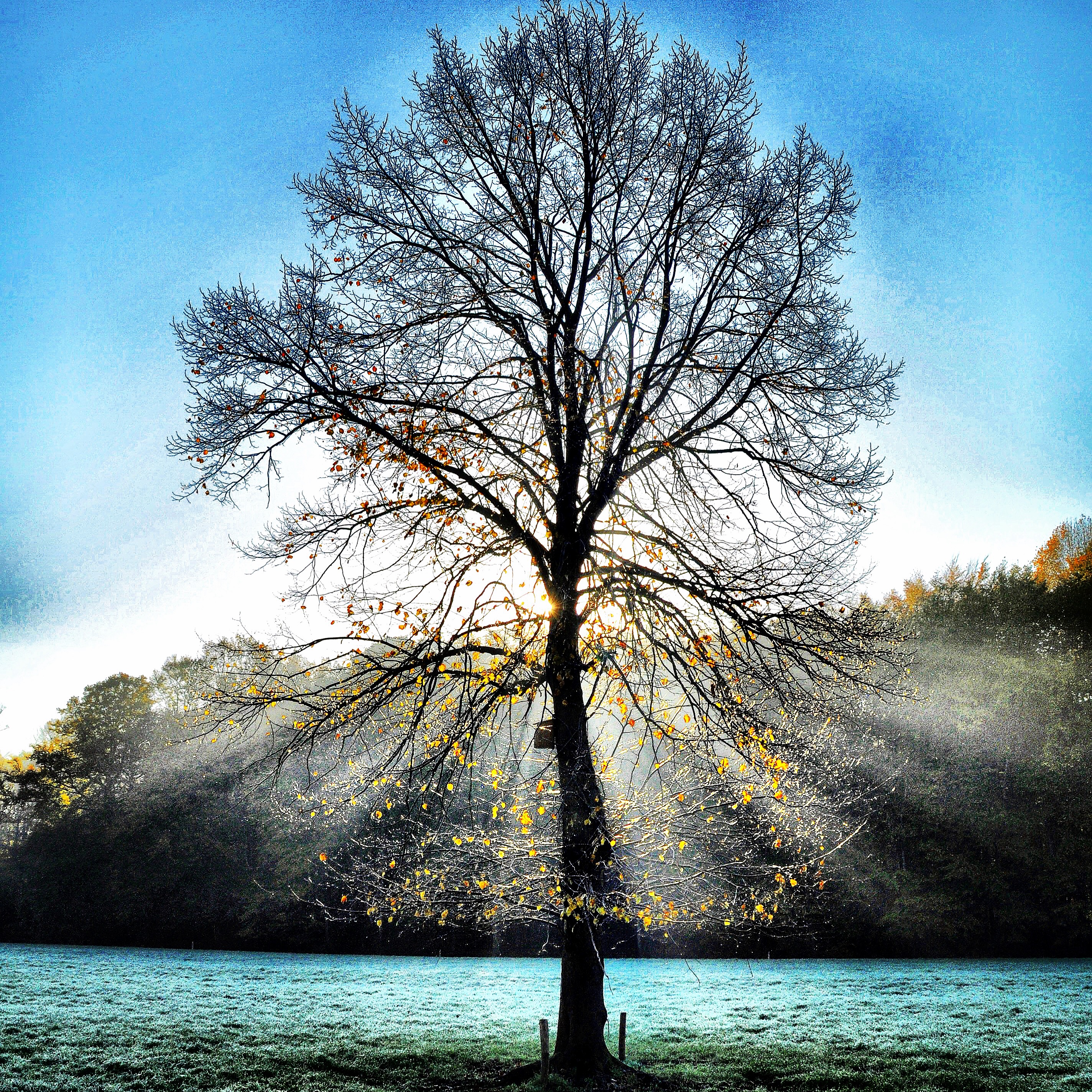 boom bij koude, blauwe zonsopkomst