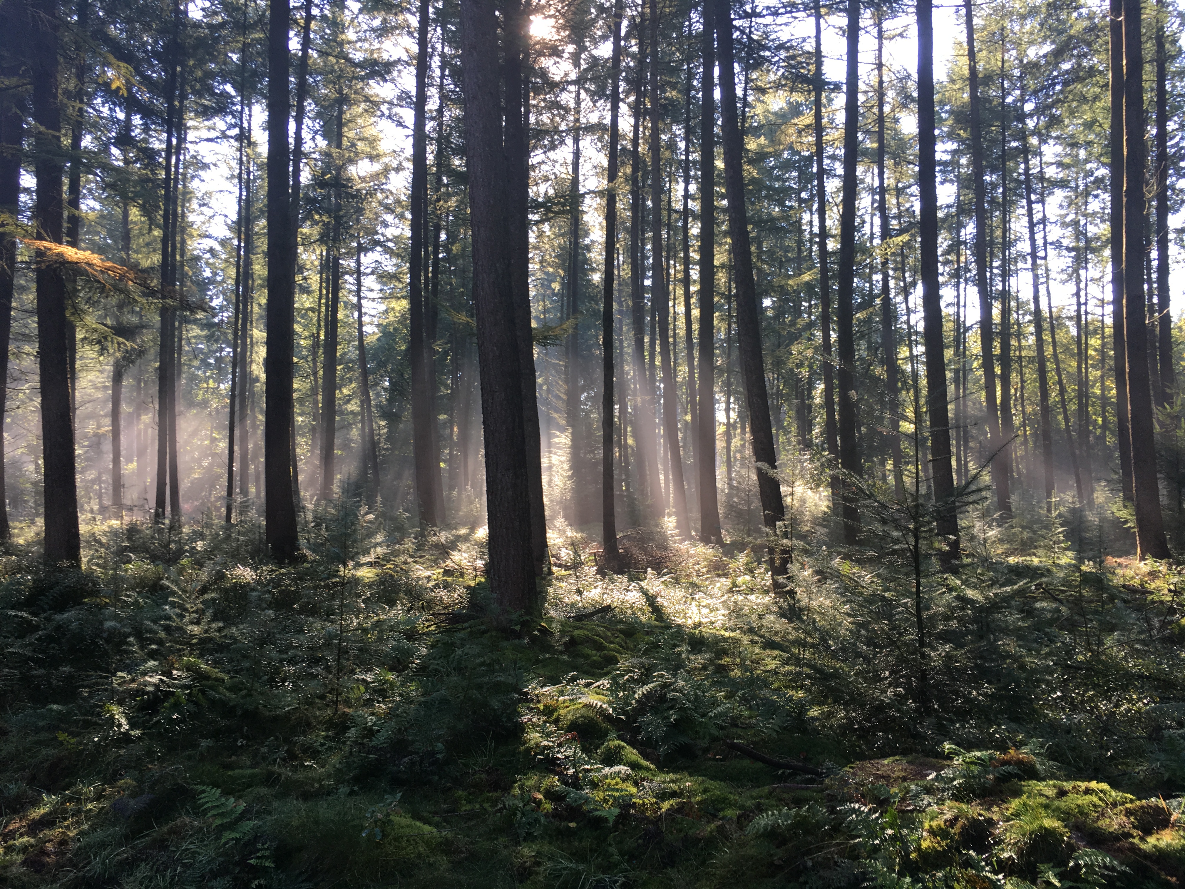 De zon die door de bomen schijnt geeft een surrealistische sfeer.