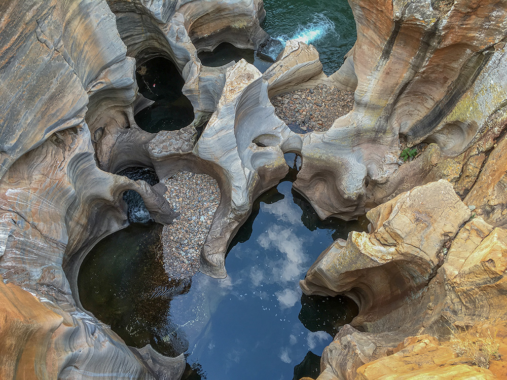 In Zuid Afrika ligt de Blyde River Canyon, waar de rivier deze potholes heeft uitgesleten. Ik maakte de foto vanaf een brug.