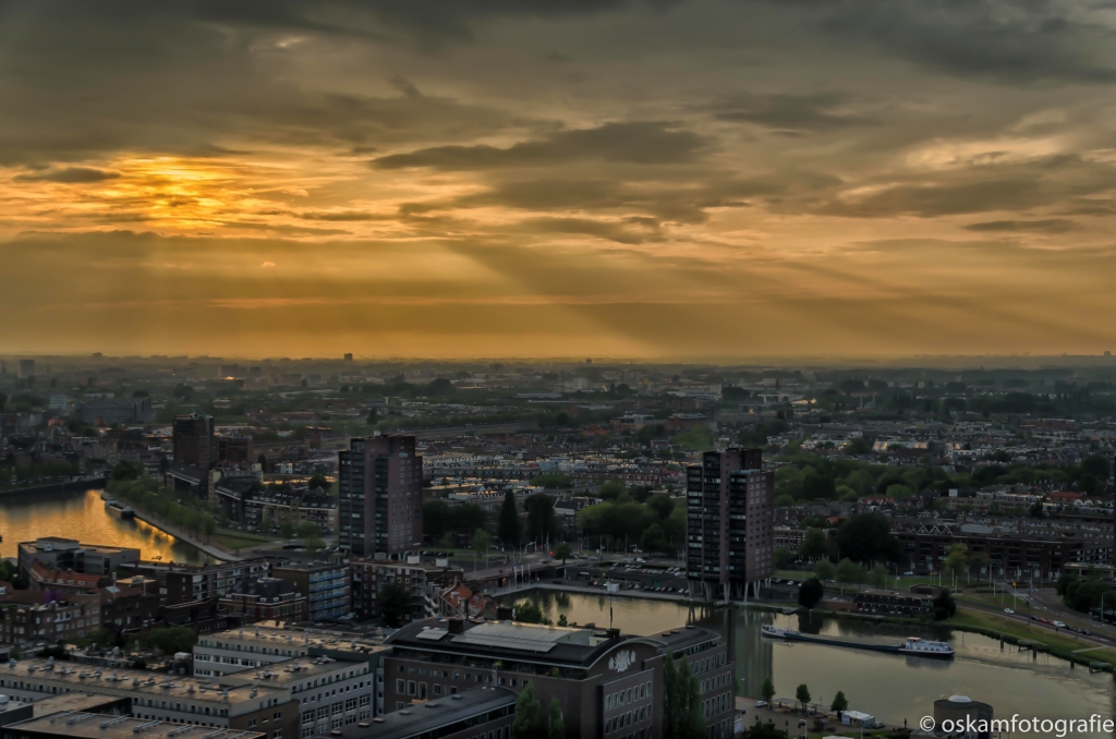 Vanaf de Euromast de skyline van Rotterdam tegen zonsondergang gefotografeerd.