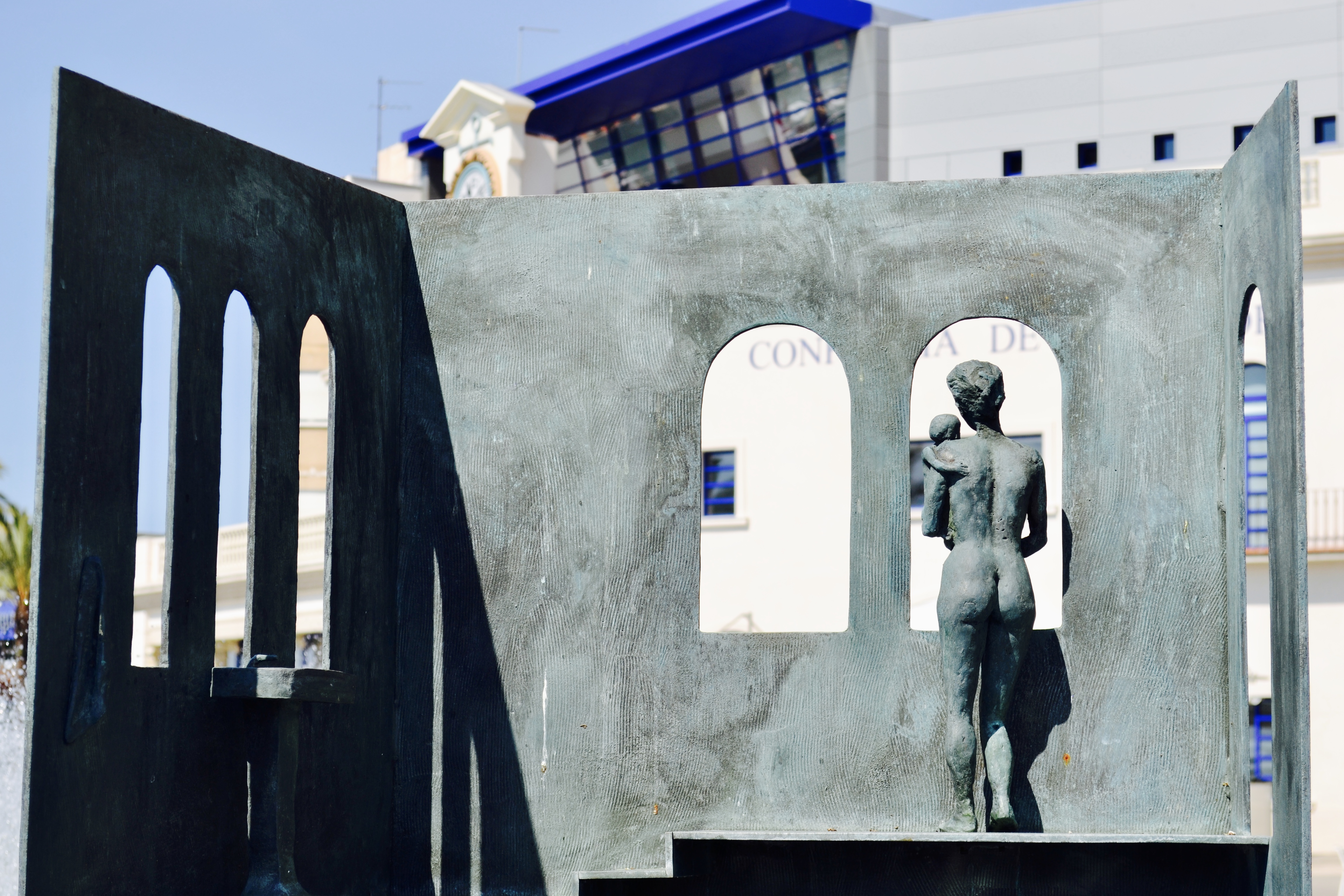 bronzen beeld van moeder met kind aan visserskade van Tarragona
