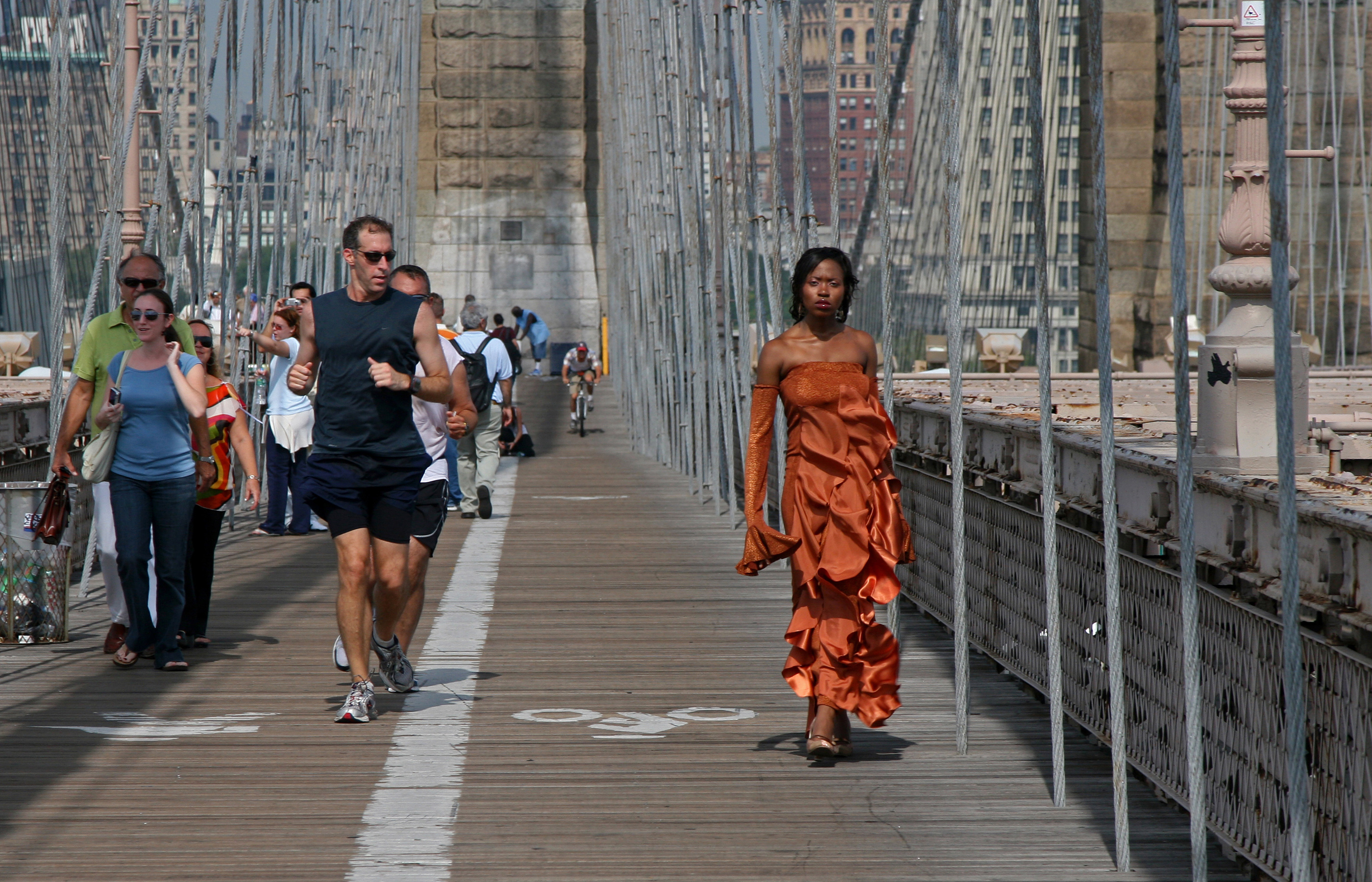 Vrouw loopt uit de pas, Brooklyn Bridge, New York City.