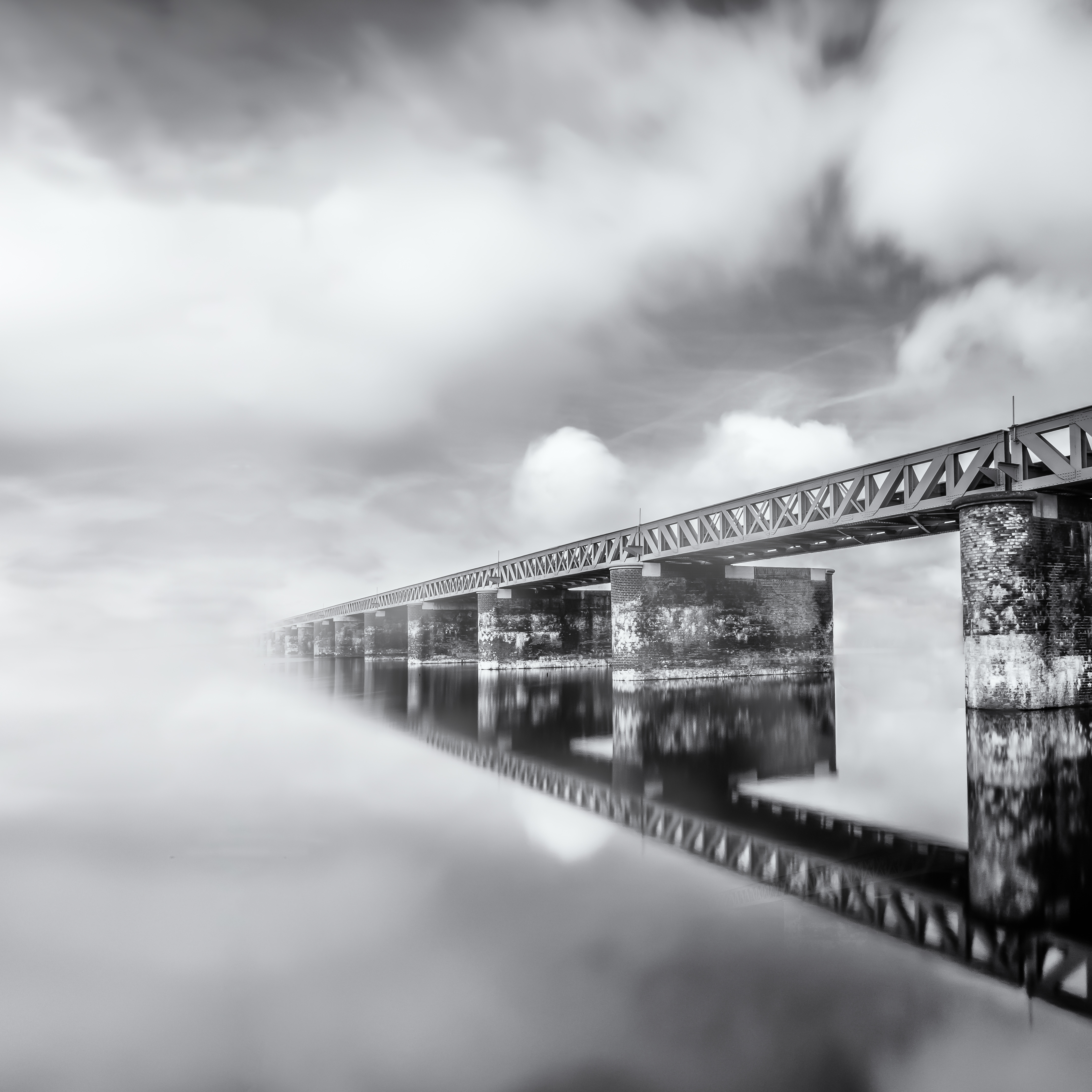 Een oude spoorwegbrug, met een reflectie in het water.