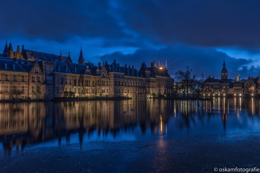 De hofvijver in Den Haag met zicht op het Buitenhof is een prachtige plek om 's avonds te fotograferen.