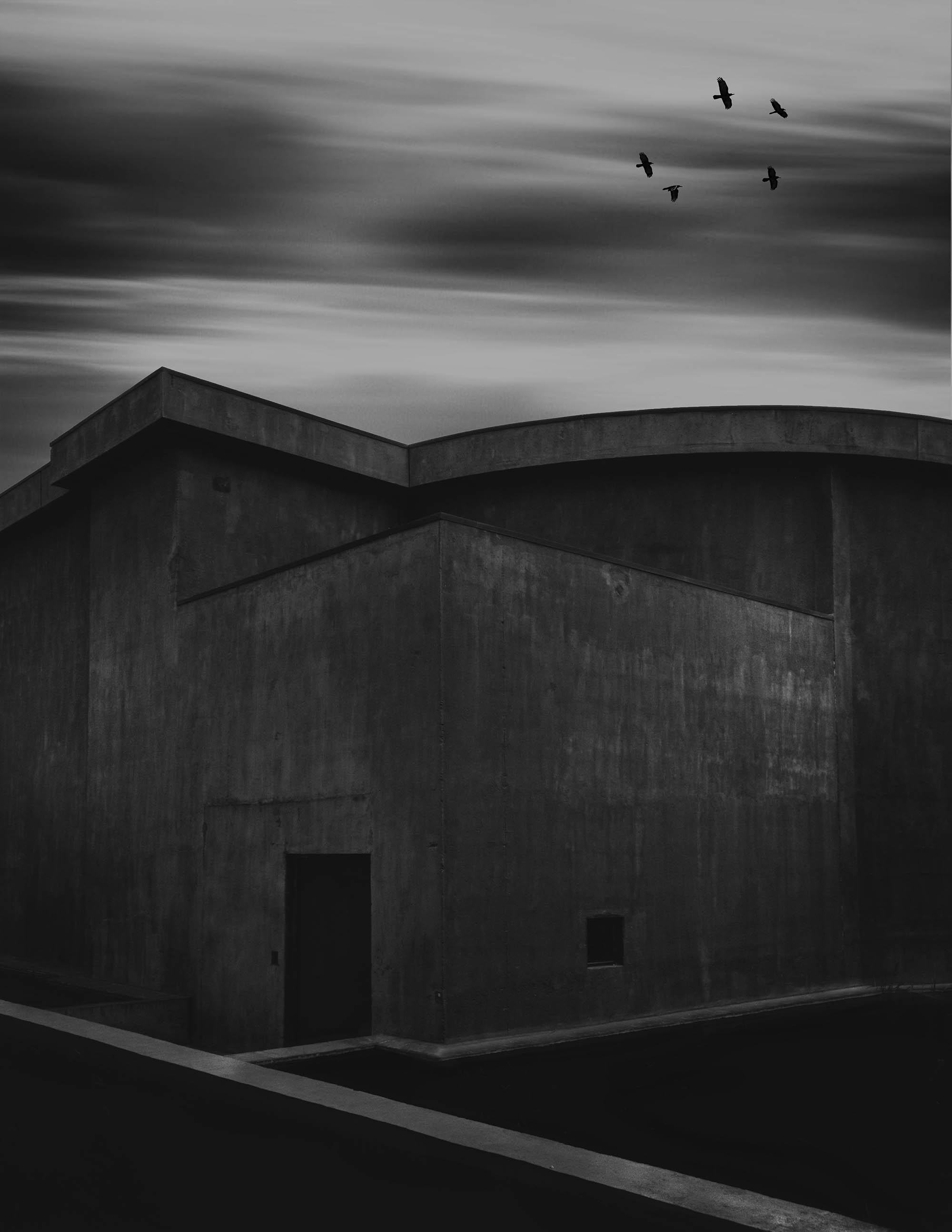 Vrij dramatische opname van een betonnen constructie midden in de Kanaalsite in Wijnegem