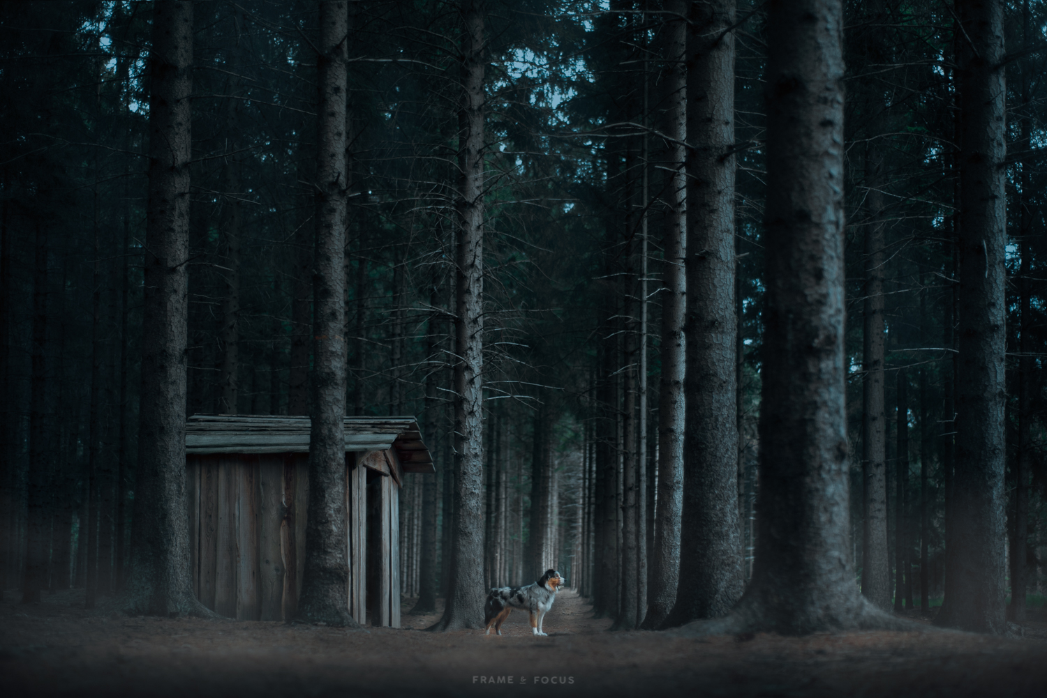 Australische herder Koda in het donkere bos.